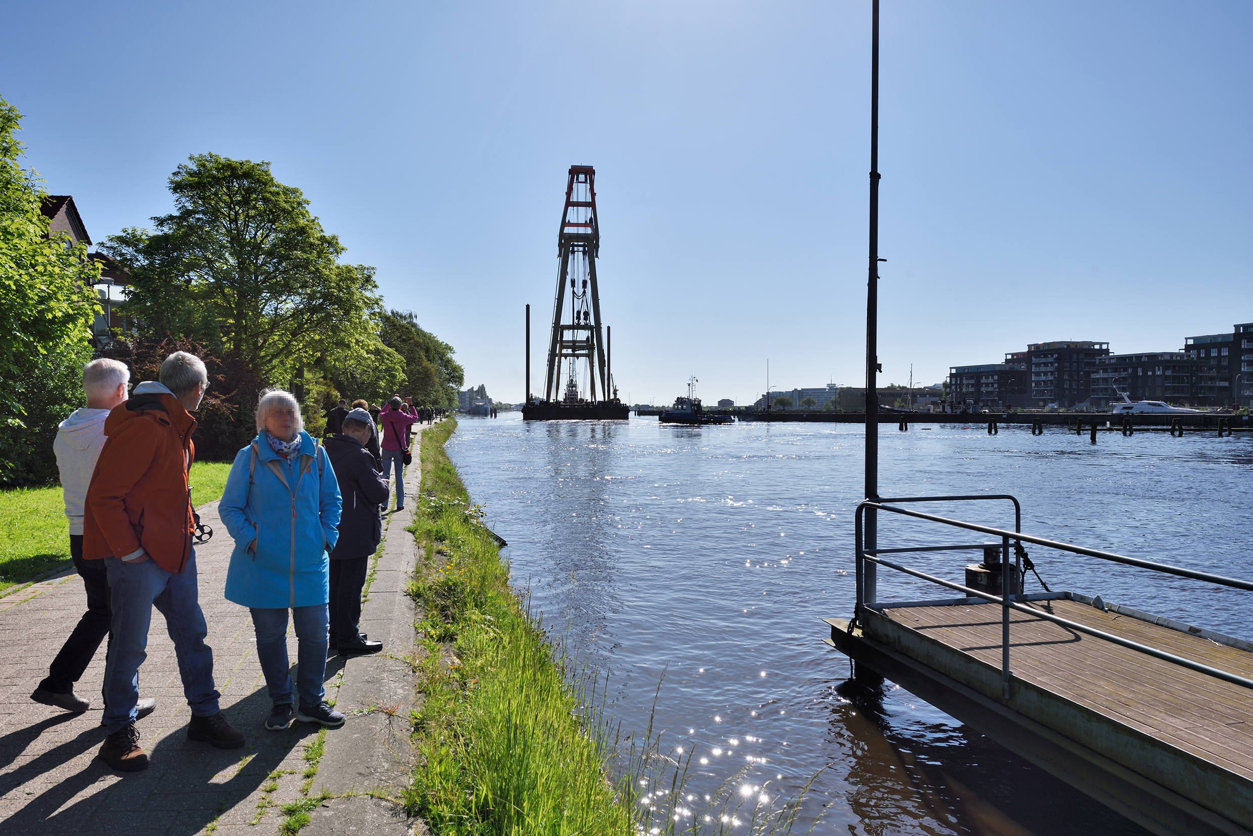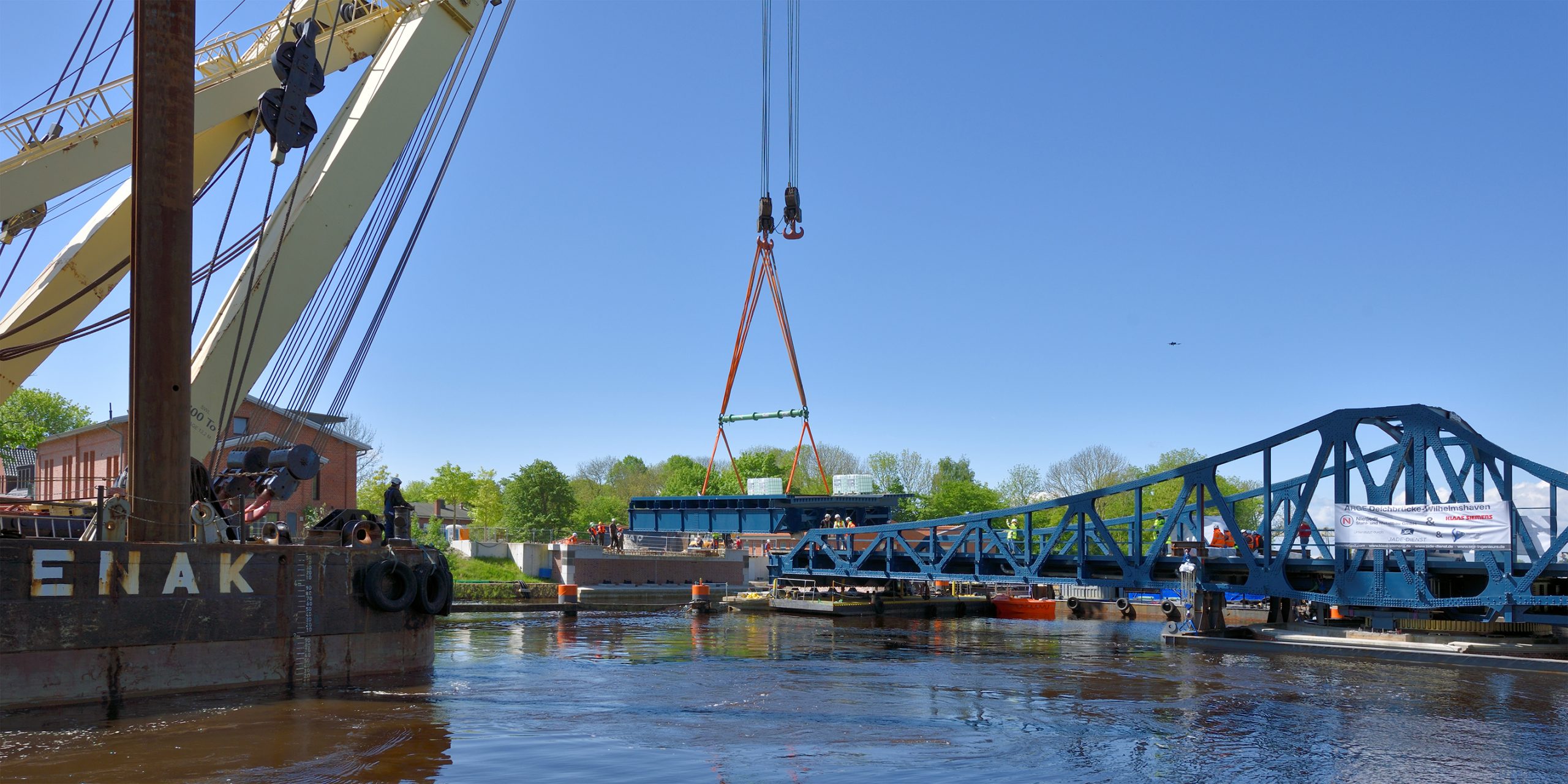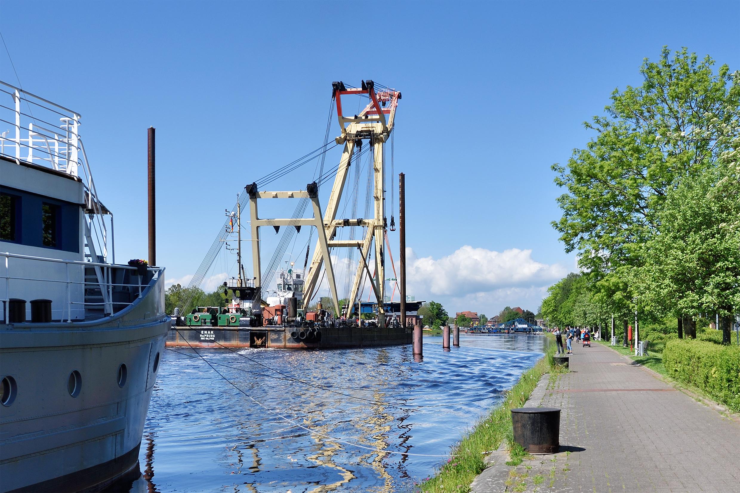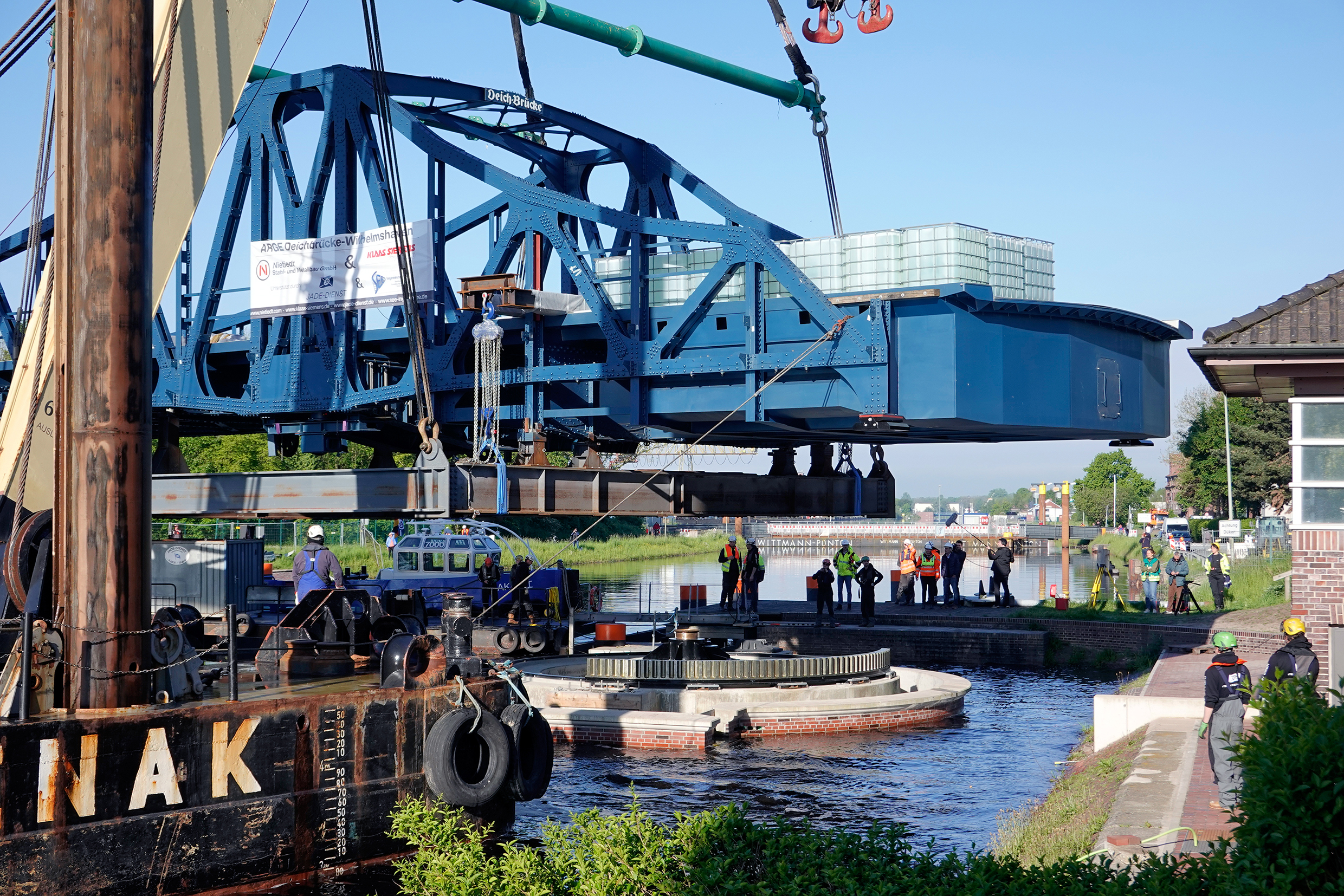 15.05.2024 I Vier Jahre lang hinterließ sie in der Jadeallee in Wilhelmshaven als fehlende Überbrückung des Ems-Jade-Kanals aufgrund von Sanierungsarbeiten eine Lücke, nun wurde sie am Mittwoch, den 8. Mai 2024 wieder eingesetzt: Die zweiteilige, über 100 Jahre alte stählerne und schwenkbare Deichbrücke, die den Straßen- und Schiffsverkehr am Übergang zwischen Kanal-Ende und Hafenbecken regelt. Dem interessierten Publikum bot sich ein spektakulärer Anblick, als Deutschlands größtes Kranschiff „ENAK“ den 440 Tonnen schweren und 42 m langen Drehteil der Brücke anlieferte. Vom Sanierungsort Hannoverkai startend, passierte das Kranschiff zunächst vorsichtig die große, beidseitig schwenkbare Kaiser-Wilhelm-Brücke und fuhr dann mit überraschend schnellem Tempo in Richtung Jadeallee weiter. Am „Einhub-Ort“ half der Kapitän mit fast millimetergenauer Steuerung des Schiffes den mit Stahlseilzügen korrigierenden Ingenieur- und Arbeitsteams dabei, das große Brückenteil punktgenau auf den Drehpfeilerkopf und die Auflager abzusetzen. Nur wenige Millimeter falsch positioniert und die Schwenkbarkeit wäre unmöglich gemacht.