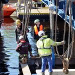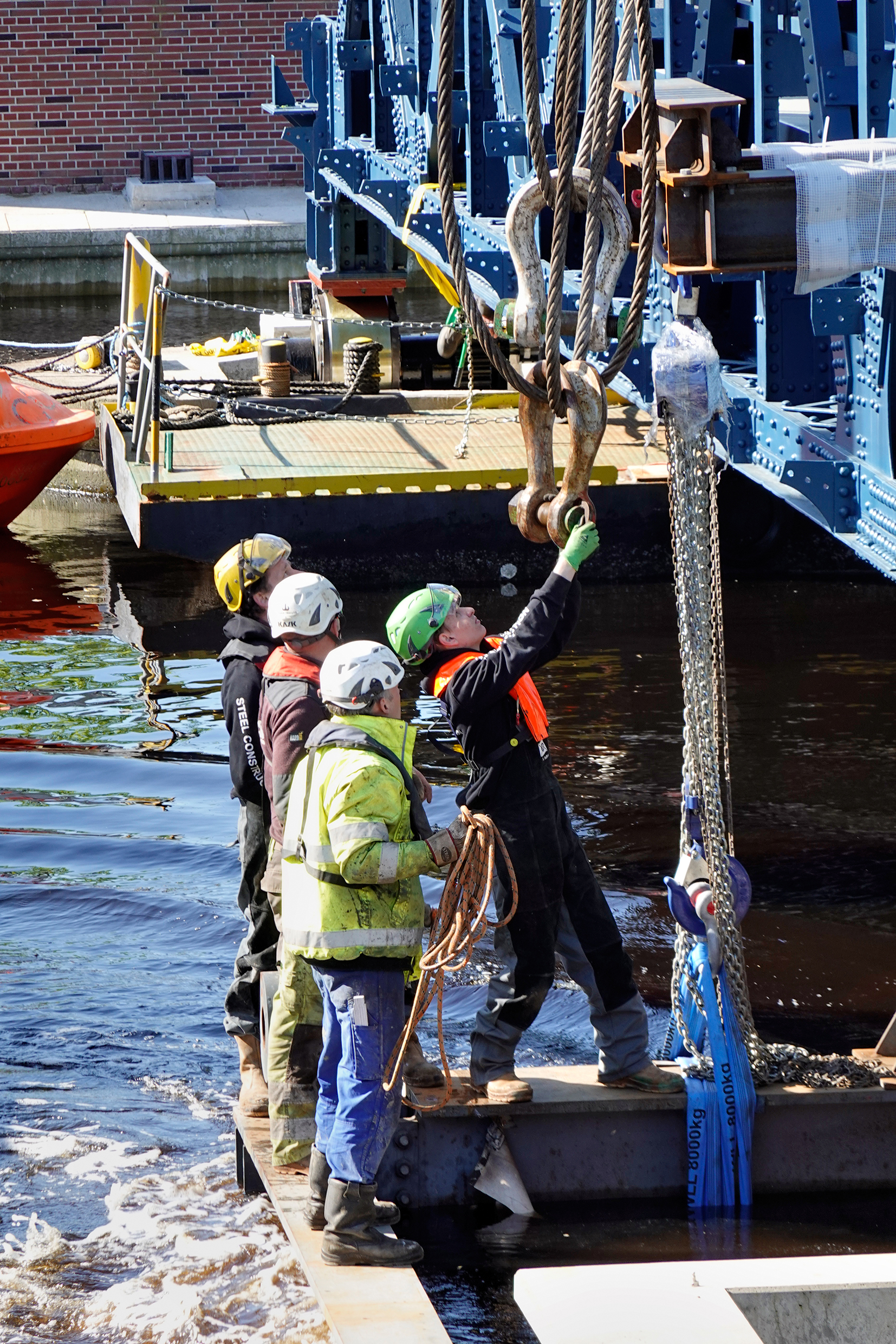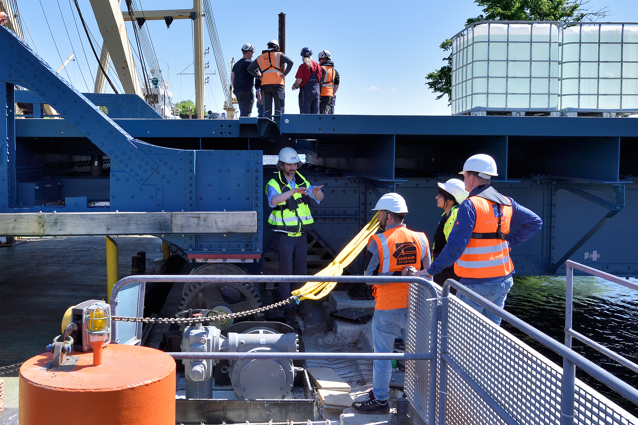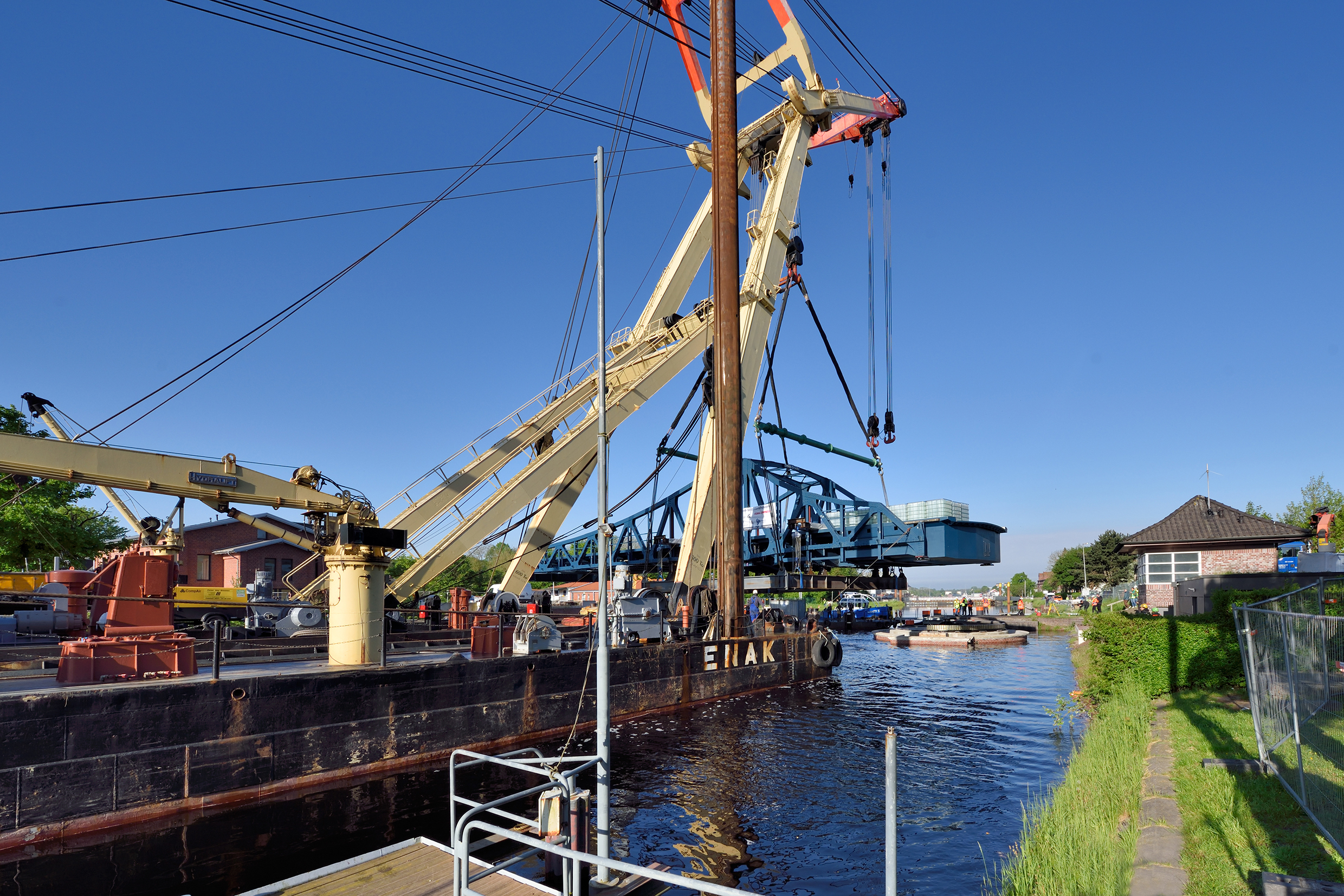 15.05.2024 I Vier Jahre lang hinterließ sie in der Jadeallee in Wilhelmshaven als fehlende Überbrückung des Ems-Jade-Kanals aufgrund von Sanierungsarbeiten eine Lücke, nun wurde sie am Mittwoch, den 8. Mai 2024 wieder eingesetzt: Die zweiteilige, über 100 Jahre alte stählerne und schwenkbare Deichbrücke, die den Straßen- und Schiffsverkehr am Übergang zwischen Kanal-Ende und Hafenbecken regelt. Dem interessierten Publikum bot sich ein spektakulärer Anblick, als Deutschlands größtes Kranschiff „ENAK“ den 440 Tonnen schweren und 42 m langen Drehteil der Brücke anlieferte. Vom Sanierungsort Hannoverkai startend, passierte das Kranschiff zunächst vorsichtig die große, beidseitig schwenkbare Kaiser-Wilhelm-Brücke und fuhr dann mit überraschend schnellem Tempo in Richtung Jadeallee weiter. Am „Einhub-Ort“ half der Kapitän mit fast millimetergenauer Steuerung des Schiffes den mit Stahlseilzügen korrigierenden Ingenieur- und Arbeitsteams dabei, das große Brückenteil punktgenau auf den Drehpfeilerkopf und die Auflager abzusetzen. Nur wenige Millimeter falsch positioniert und die Schwenkbarkeit wäre unmöglich gemacht.