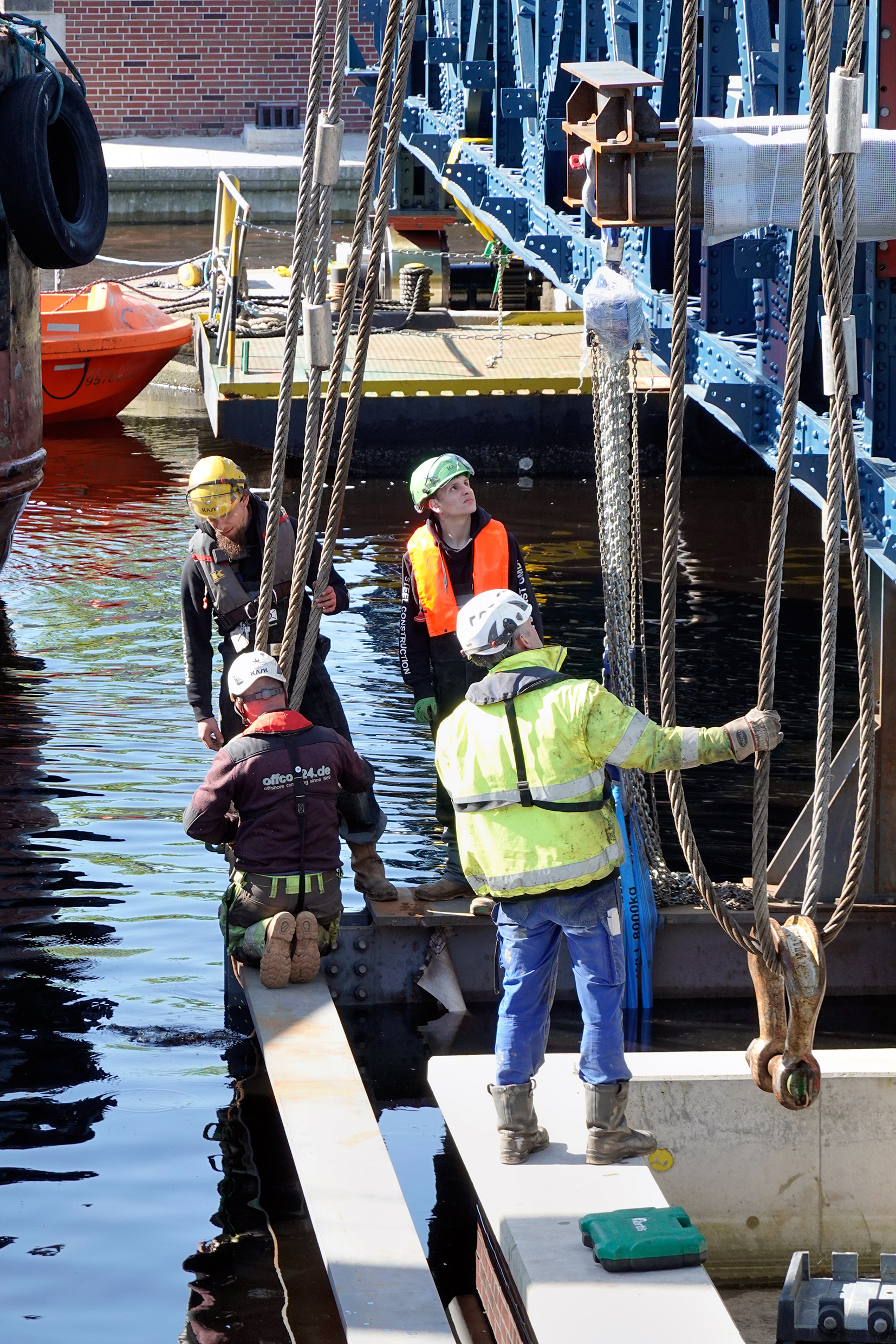 Obwohl am selben Tag auch noch das 13 m kurze Landteil der Brücke eingesetzt werden konnte, dürfte die Nutzung der Brücke wohl erst in rund drei Monaten möglich sein. Der pb+ Projektleiter, Dipl.-Ing. Marko Nitsche zu den Gründen: „Wir müssen noch die endgültige Lagerung der beiden Brückenteile herstellen, und außerdem erhält die Deichbrücke eine neue Ausstattung mit Antriebs- und Elektrotechnik, Beleuchtung, Geländer sowie eine Gehwegkonsole mit Holzbelag.“ Der nördliche und südliche Anschluss der Jadeallee benötigt ebenfalls noch Bauarbeiten, um sie wieder befahren zu können.