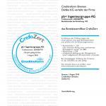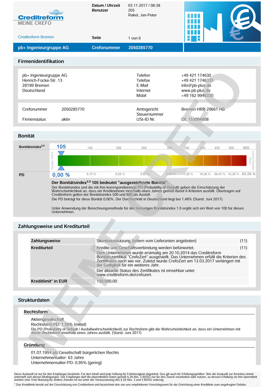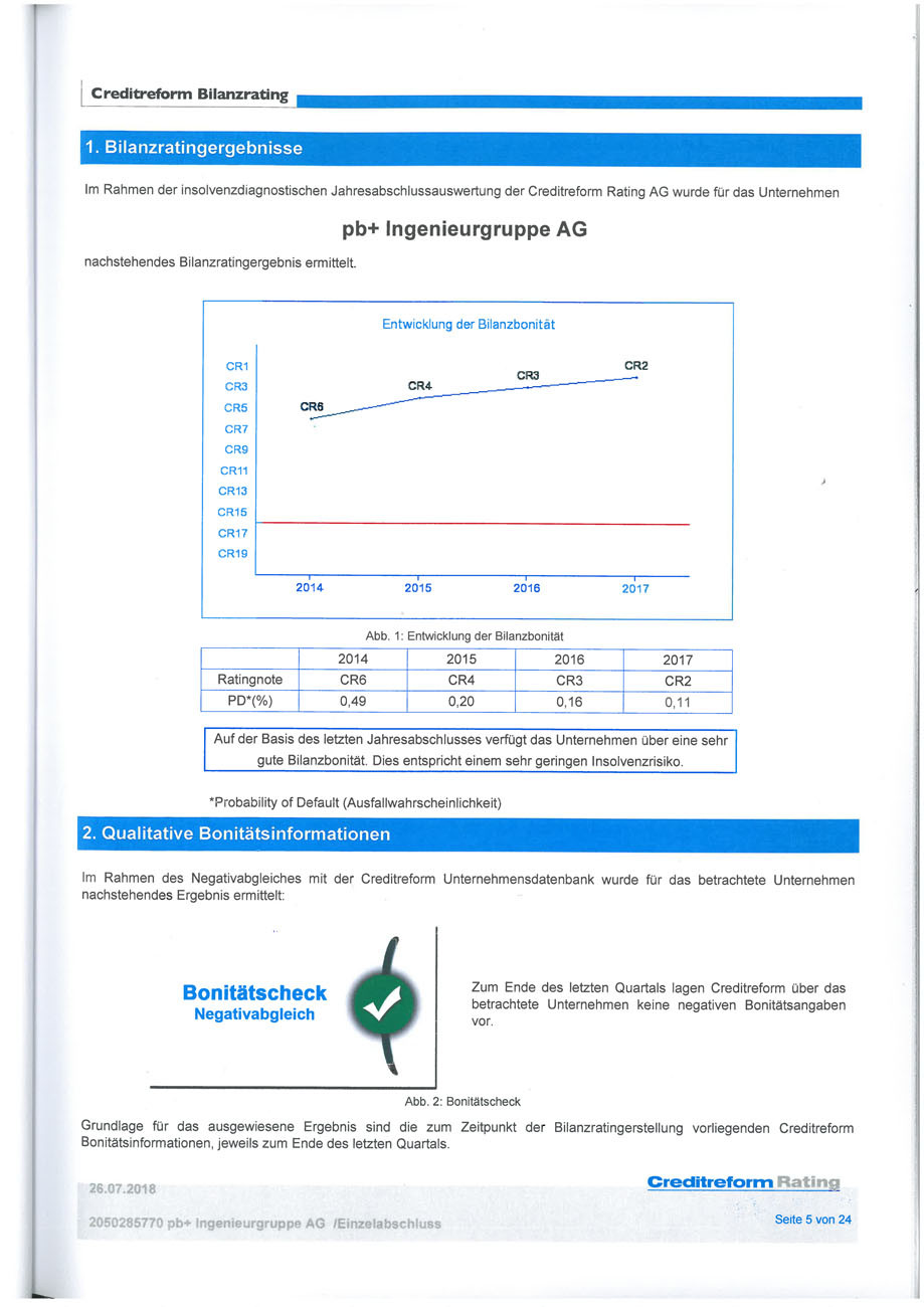 September 2018 | Die pb+ Ingenieurgruppe AG erhielt von Creditreform das Bilanzrating „CrefoZert“ in der obersten von sechs Hauptbilanzratingklassen mit CR 2 und einem Bonitätsindex von 105 ausgestellt. Laut Creditreform gehört pb+ damit zu den weniger als ein Prozent der deutschen Unternehmen, denen eine außergewöhnlich gute Bonität bescheinigt wird. Seit 2014 konnte sich pb+ bei der jährlichen Prüfung durch Creditreform innerhalb der Einstufungsskala von 1 (Bestnote) bis 19 kontinuierlich verbessern. Die Ratingergebnisse der zurückliegenden Jahre:
