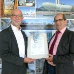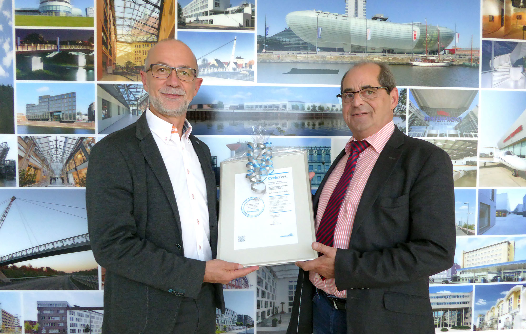Bildlegende: Zertifikatübergabe: Links Dr.-Ing. Manfred Arend (pb+ Vorstand) und Jörg Hartmann (Creditreform Bremen Dahlke KG)
