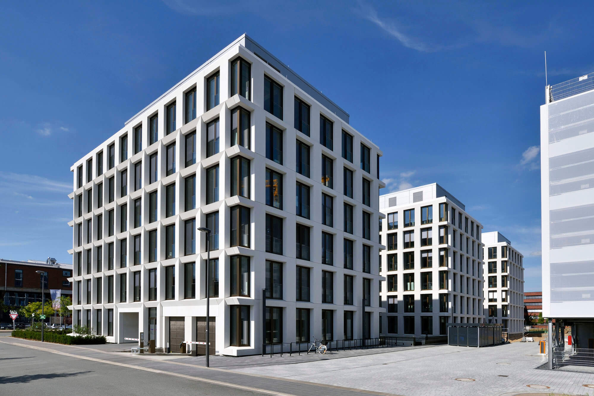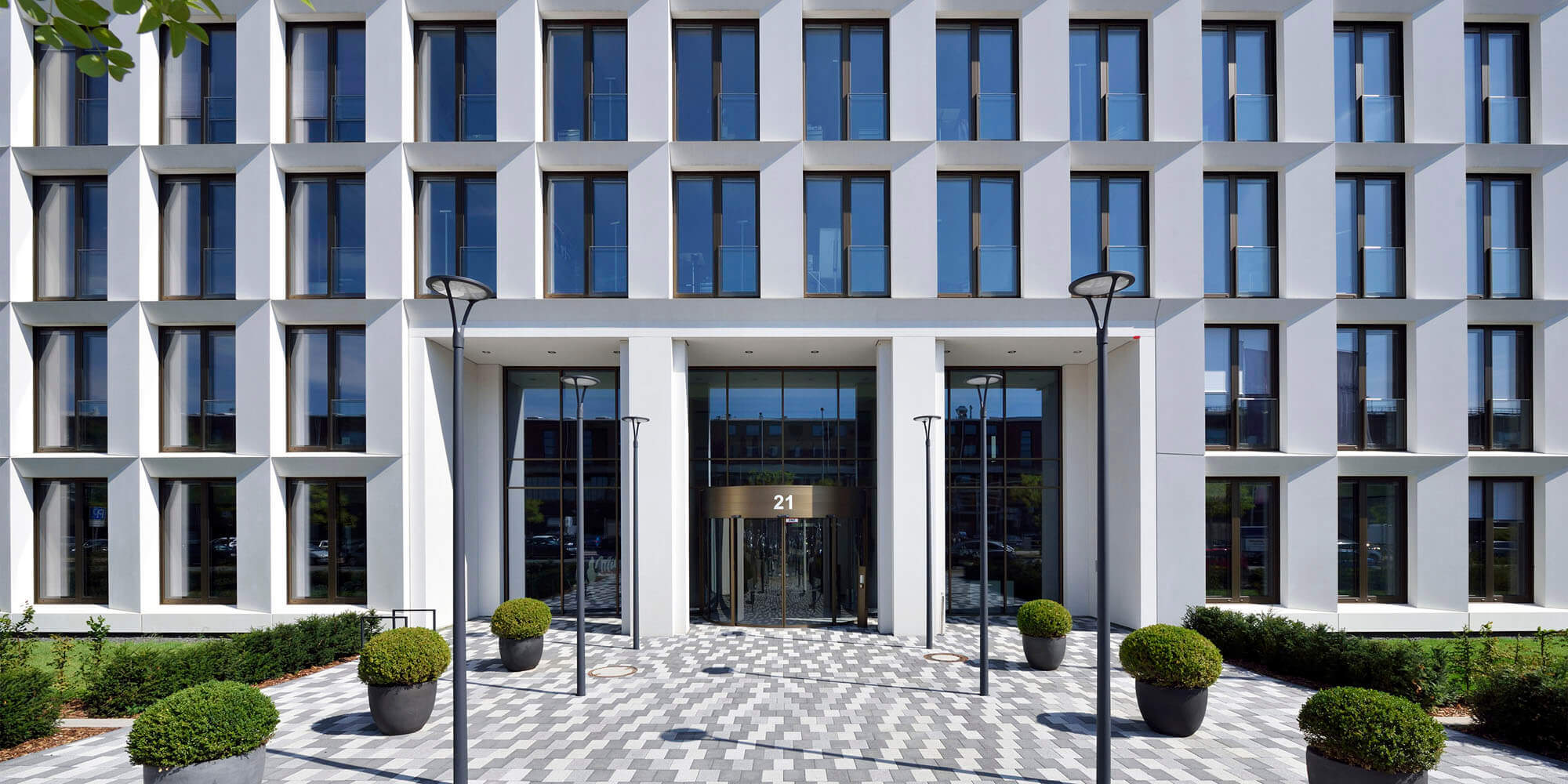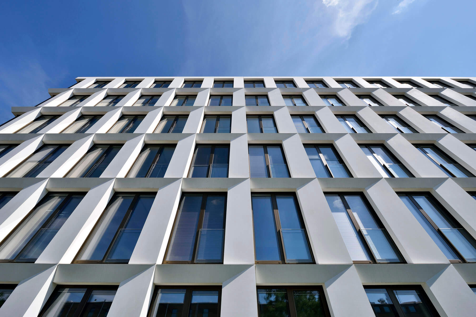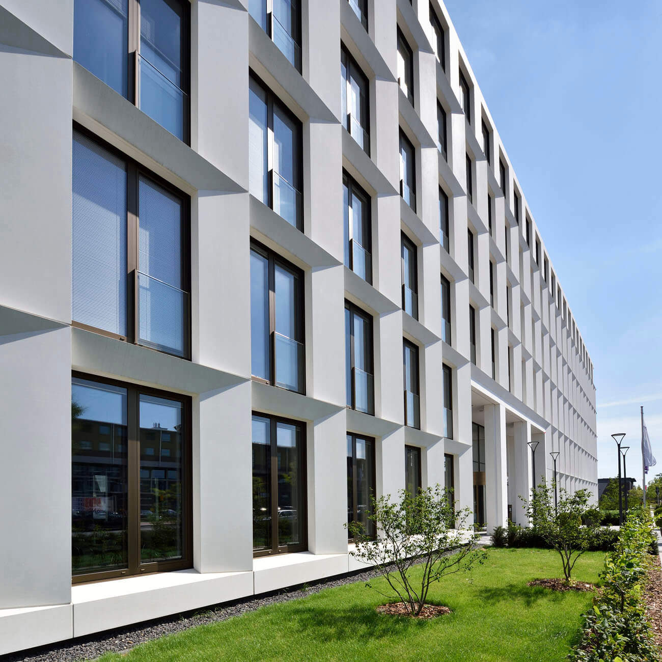 Das neue Office Center in der Konsul-Smidt-Str. 21 in der Überseestadt zeigt optisch und konstruktiv in dieser exponierten Lage besondere Raffinesse. Die Fassadenelemente aus Beton-Fertigteilen sorgen für eine attraktive dreidimensionale Wirkung und lockern das bodentiefe Fensterraster des 6-geschossigen Bürokomplexes gekonnt auf. Die Betonfertigteile bestehen aus einer weiß eingefärbten, gesäuerten und hydrophobierten Oberfläche, die Schmutz und Wasser abweist. Die konstruktive Besonderheit besteht darin, dass die F-förmigen Fassadenelemente zugleich das Gebäude tragen. Die pb+ Ingenieurgruppe AG zeichnete u. a. für die Tragwerksplanung verantwortlich.