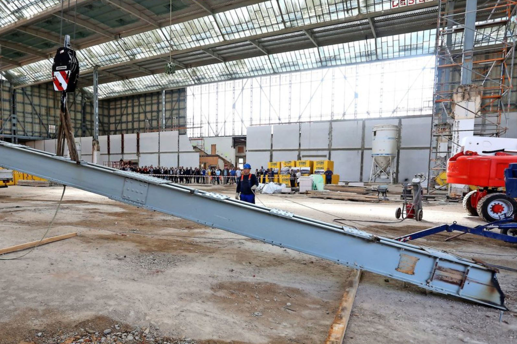 Bild oben: Als Richtfest-Zeremonie wurde eine der später eingebauten und nicht denkmalgerechten Pendelstützen in der riesigen Ausstellungshalle wieder entfernt. Foto: André Kempner