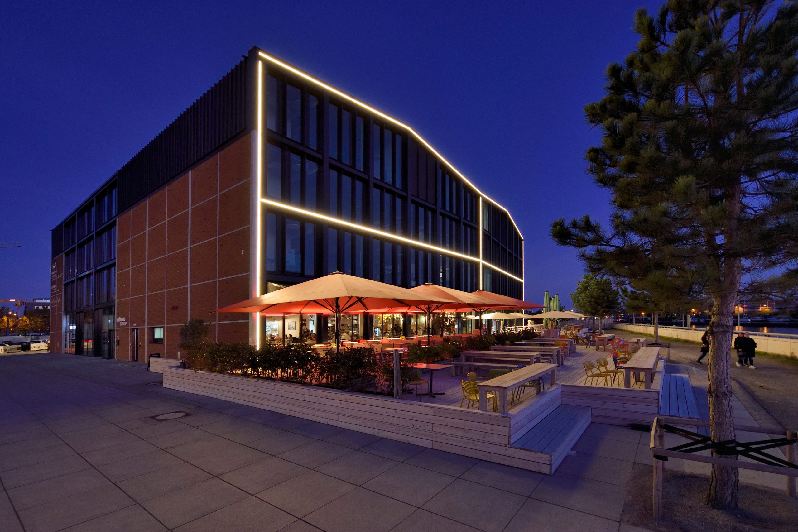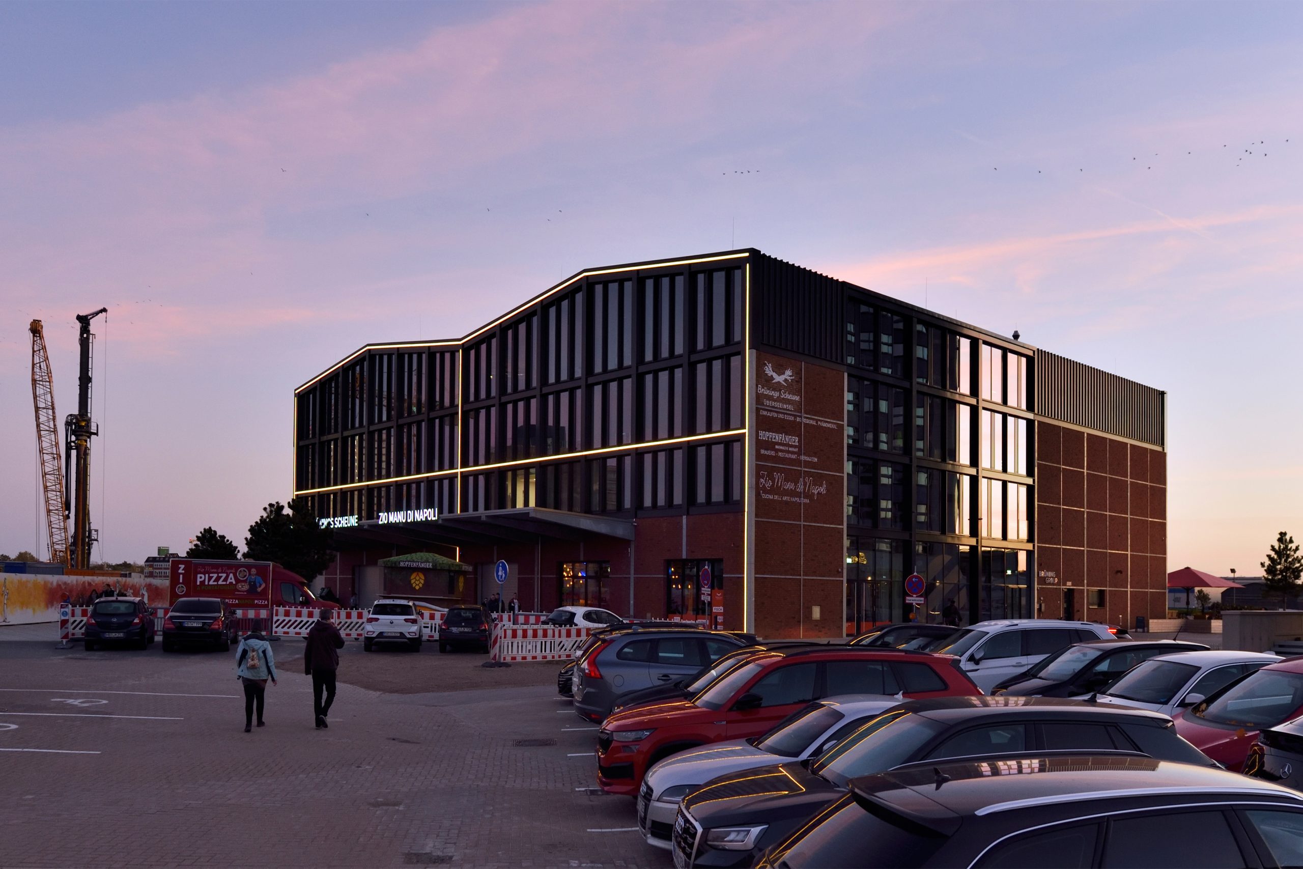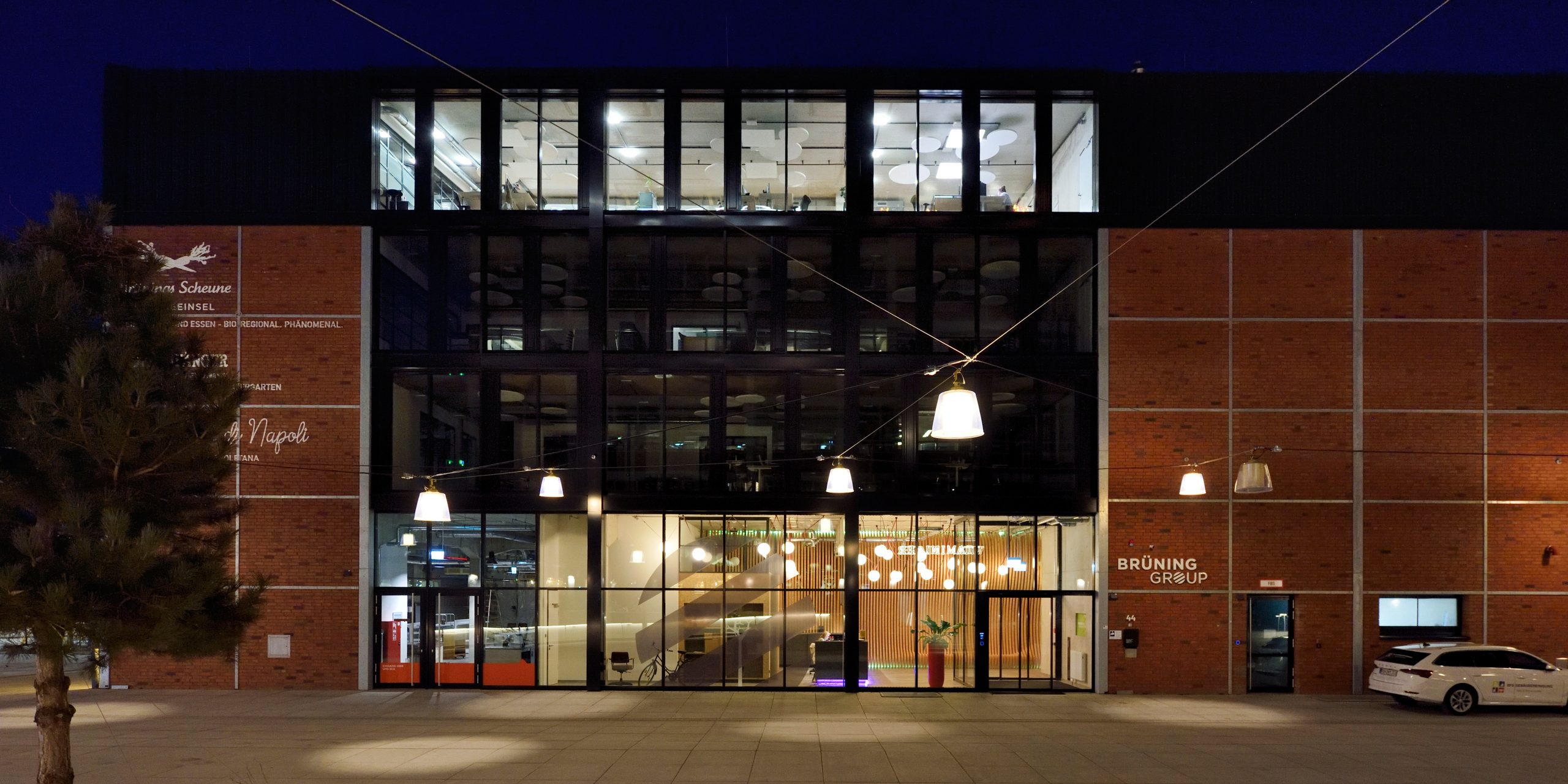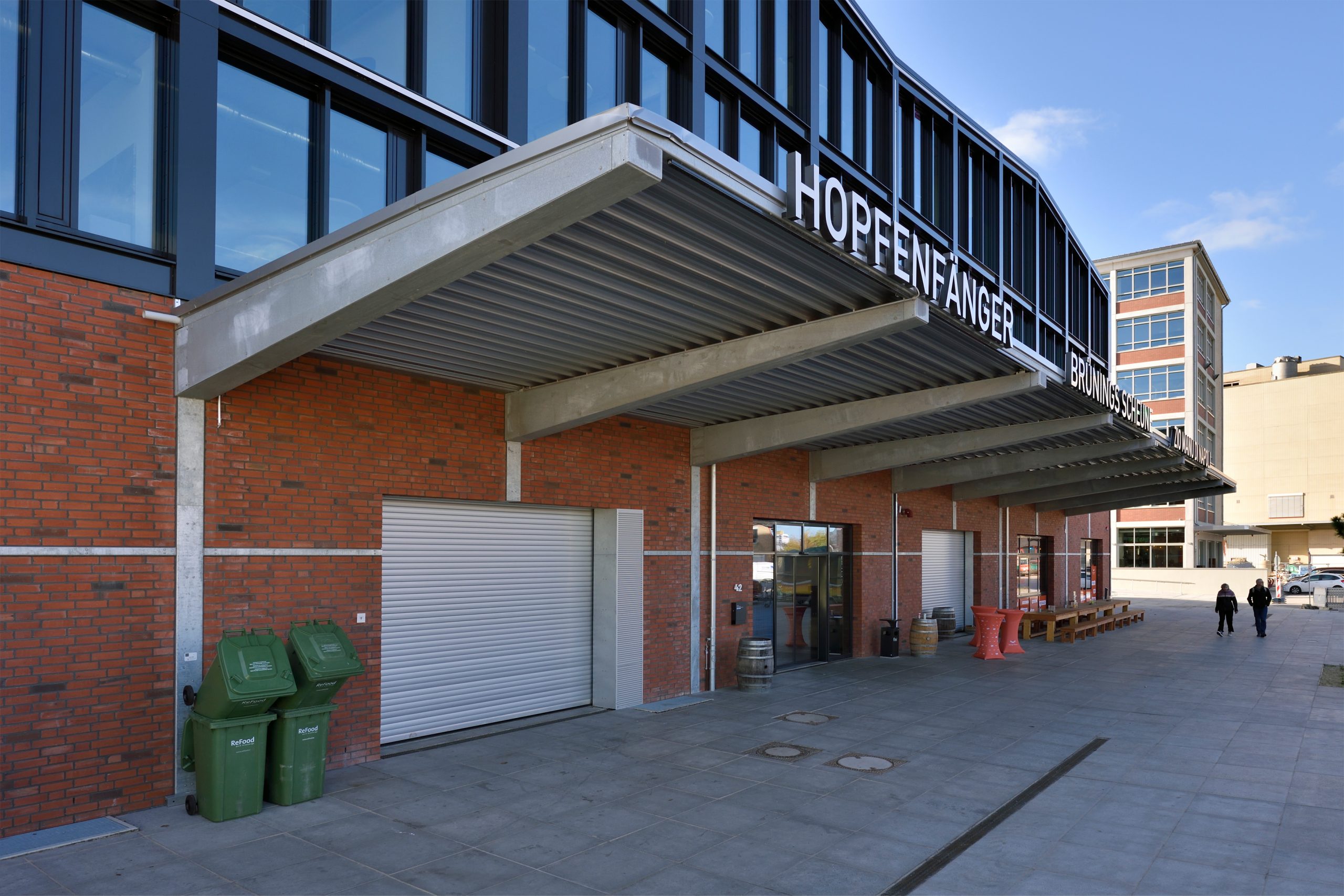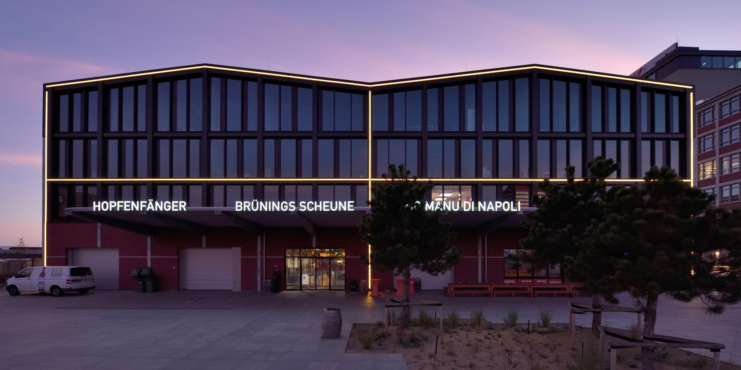 Das Erdgeschoss der neuen Markthalle teilt sich ein Gastronomie-Trio: die Bremer Braumanufaktur („Hopfenfänger“), „Brünings Scheune“ mit Feinkost sowie die Pizzeria „Zio Manu di Napoli“. Die Pizzeria gewährt durch eine Glaswand Einblicke in die Zubereitung ihrer Speisen. Ebenfalls hinter einer Glaswand, die sich für Events öffnen lässt, befindet sich die Anlage der Bremer Braumanufaktur. Hier gibt es Hopfenfänger-Bier für die Durstigen und Seminare sowie Besichtigungen für Interessierte am Brauvorgang. Die Markthallen-Gastronomie bietet den Gästen 330 Plätze im Inneren und etwa 450 Plätze auf der Terrasse. In den drei oberen Etagen befinden sich die Büros der Brüning Group, die 2023 ihren alten Standort in Fischerhude verließ, um ihren neuen Hauptsitz in der Markthalle zu beziehen.