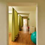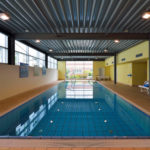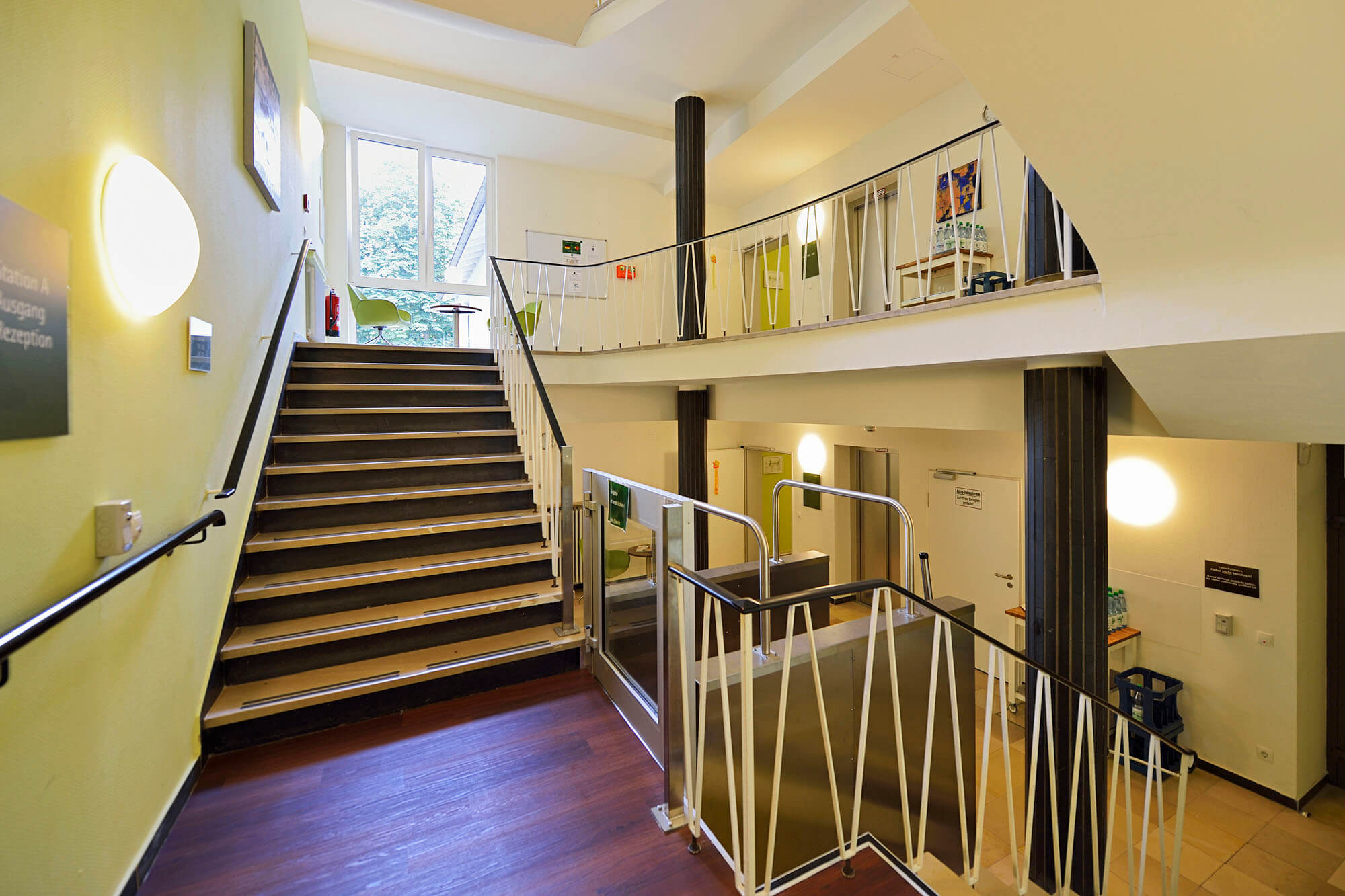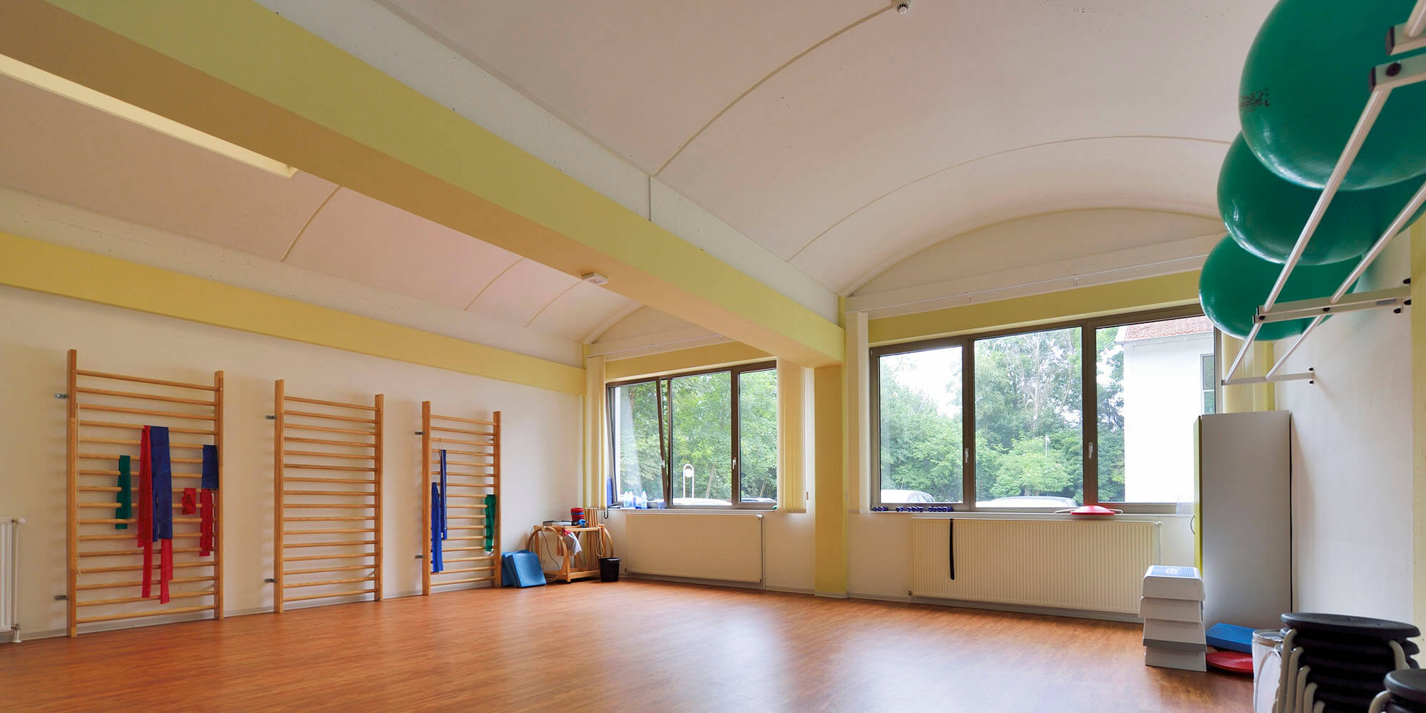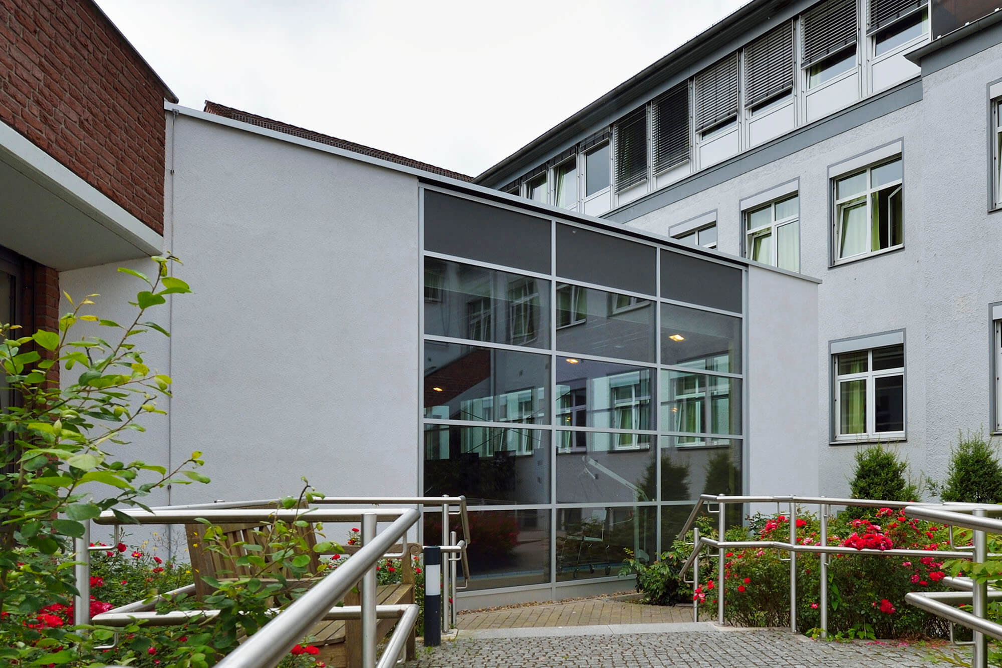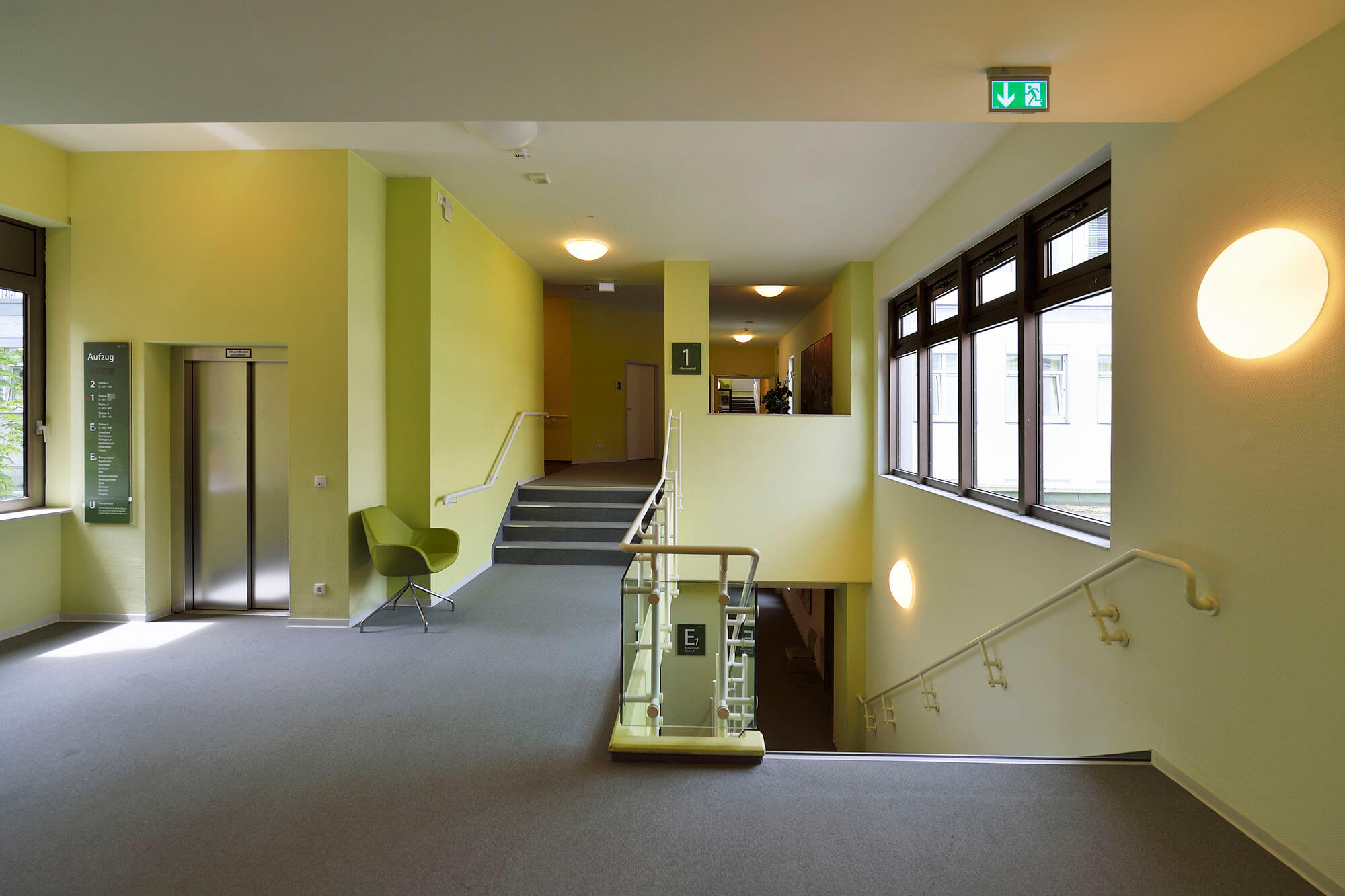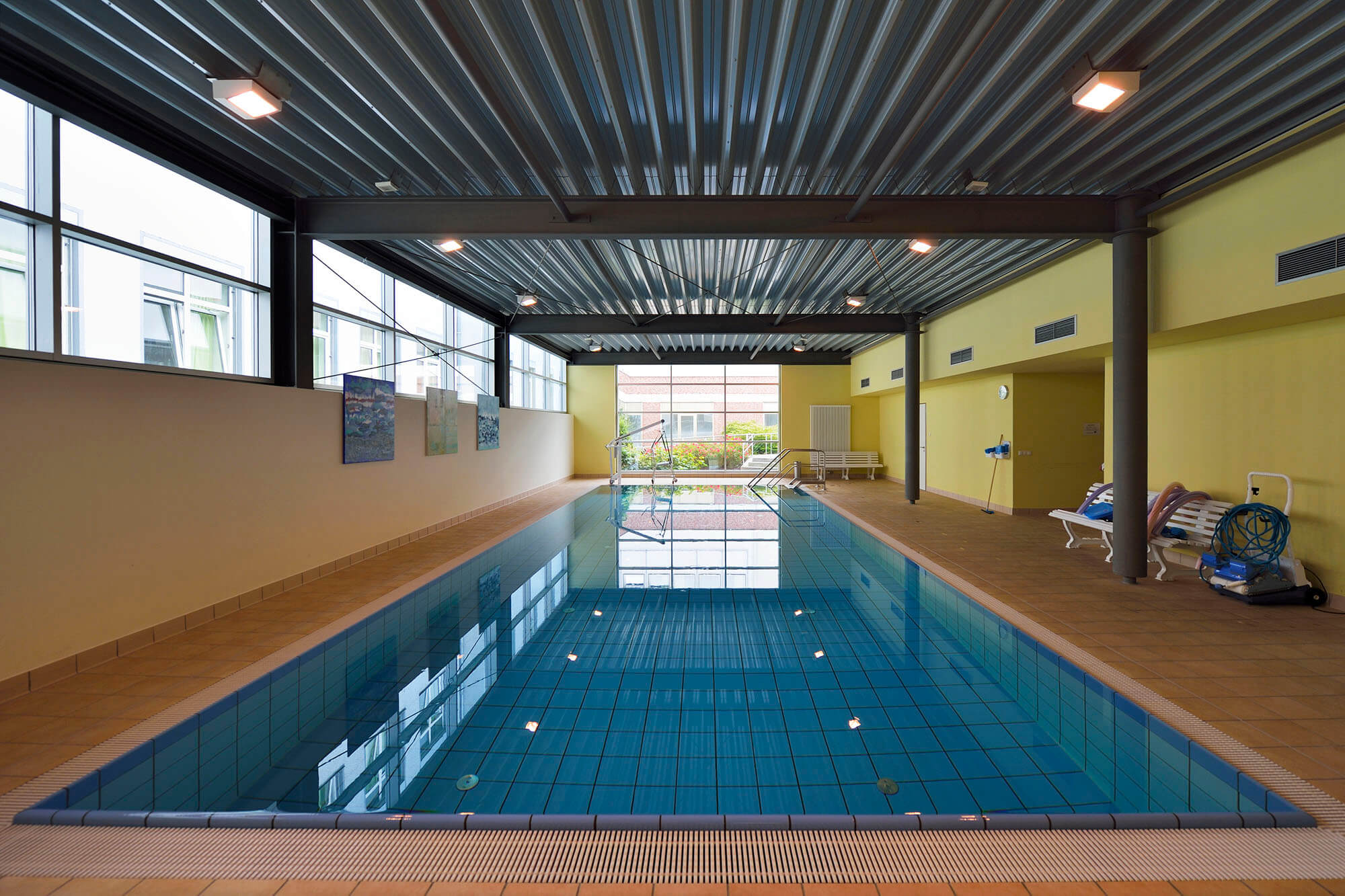 Das Bewegungsbad im Innenhof gründet auf Kleinbohrpfählen und ist mit einem Stahlbetonbecken und einer Stahlhallenkonstruktion versehen. In den Gebäudeteilen betreute pb+ aus statischer Sicht die Neuorganisation der Raumaufteilung und den Rückbau von vorhandenen Konstruktionen. So wurden z. B. aus den ehemaligen Redaktionszimmern zu beiden Seiten eines langen Flurs Einbettzimmer für Patienten und die Sprecherkabinen zu Funktionszimmern mit neuer Aufteilung. Eine besondere Herausforderung stellte dabei das nicht Vorhandensein von Bestandsunterlagen für große Teile des Gebäudekomplexes dar. Das vorgelagerte Restaurant besteht aus einem Massivbau mit angekoppelter Glashalle und ist mit einem Tragsystem aus Stahlstützen und Brettschichtholzbindern konzipiert.