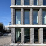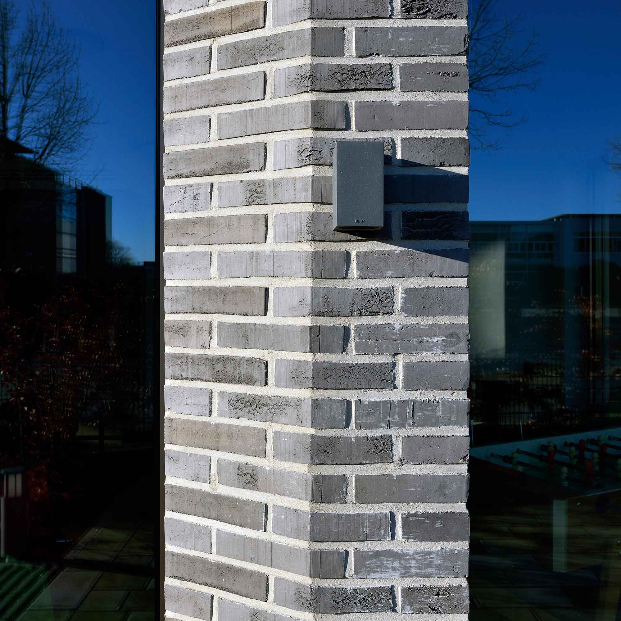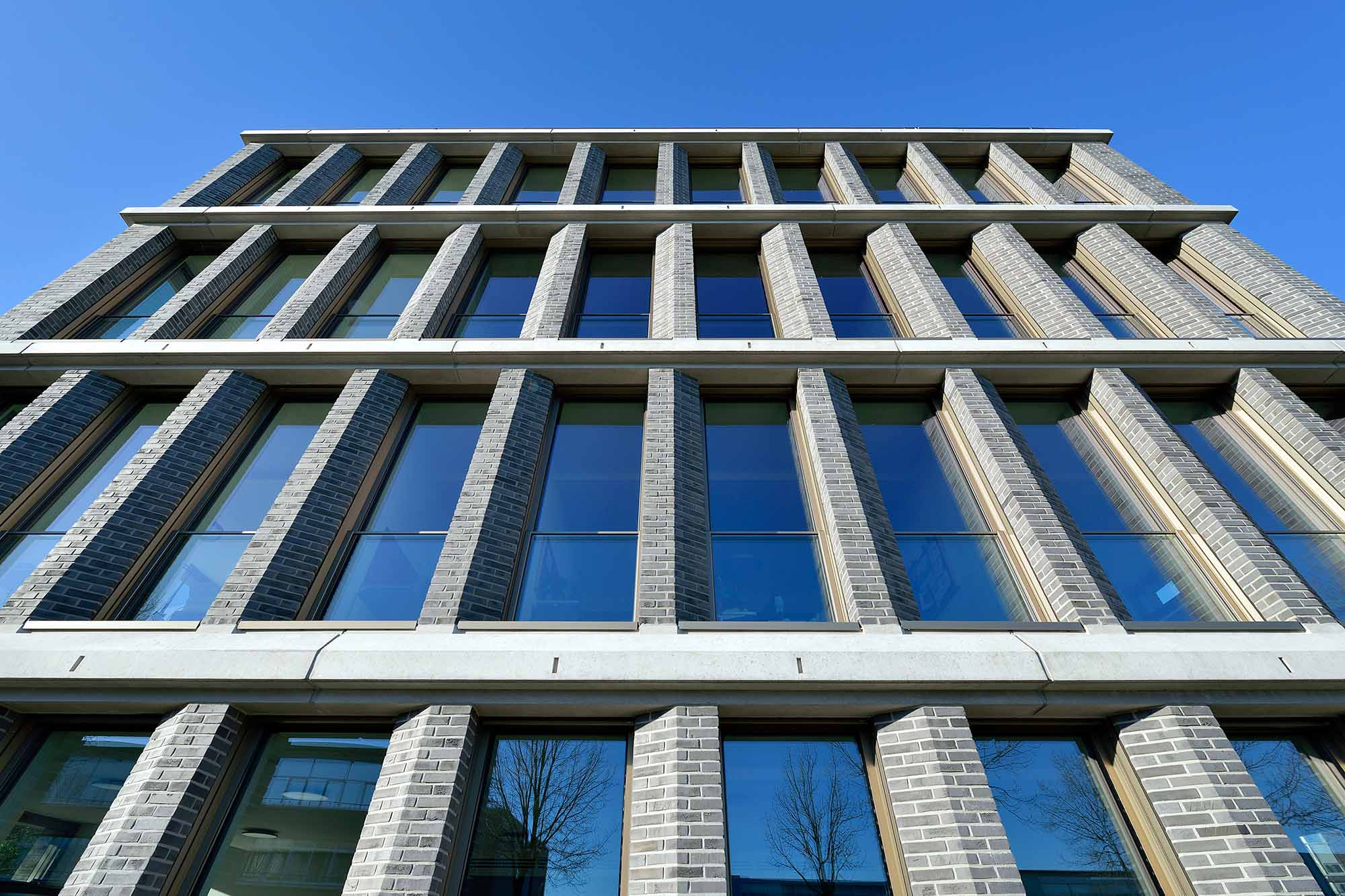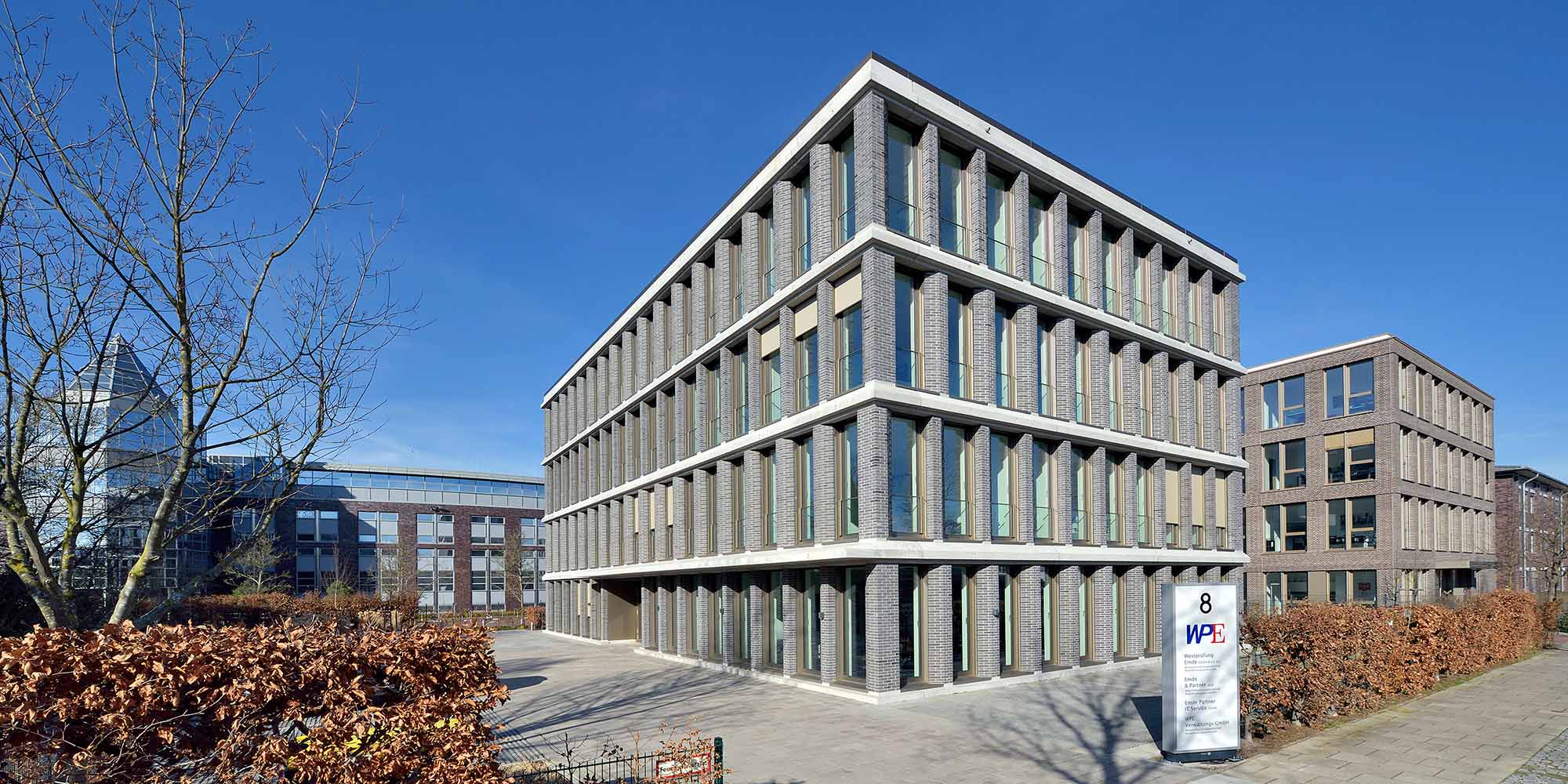 Von Außen fallen beim Büro-Neubau für Emde & Partner im Bremer Technologiepark zunächst die geschossweise variierenden Abschrägungen der Mauerwerkpfeiler auf, die so die massive Gebäudepräsenz optisch wieder etwas auflockern. Die mit der Tragwerksplanung und thermischen Bauphysik beauftragte pb+ Ingenieurgruppe AG löste die markantesten Herausforderungen jedoch in den Räumlichkeiten hinter der Fassade.