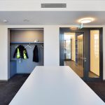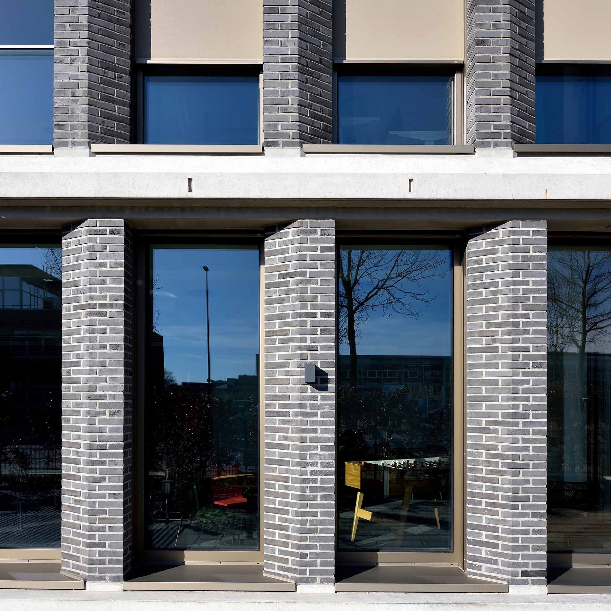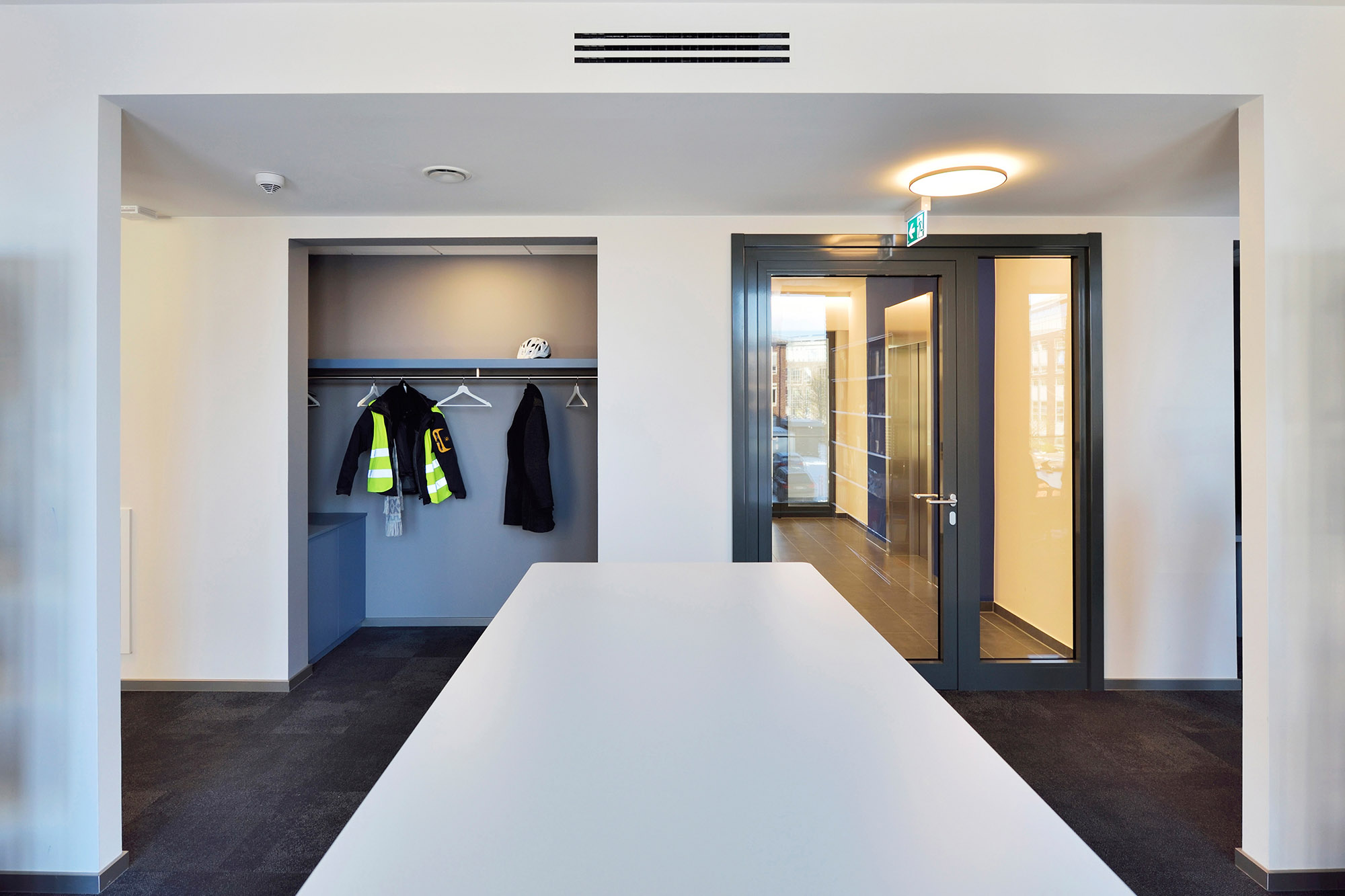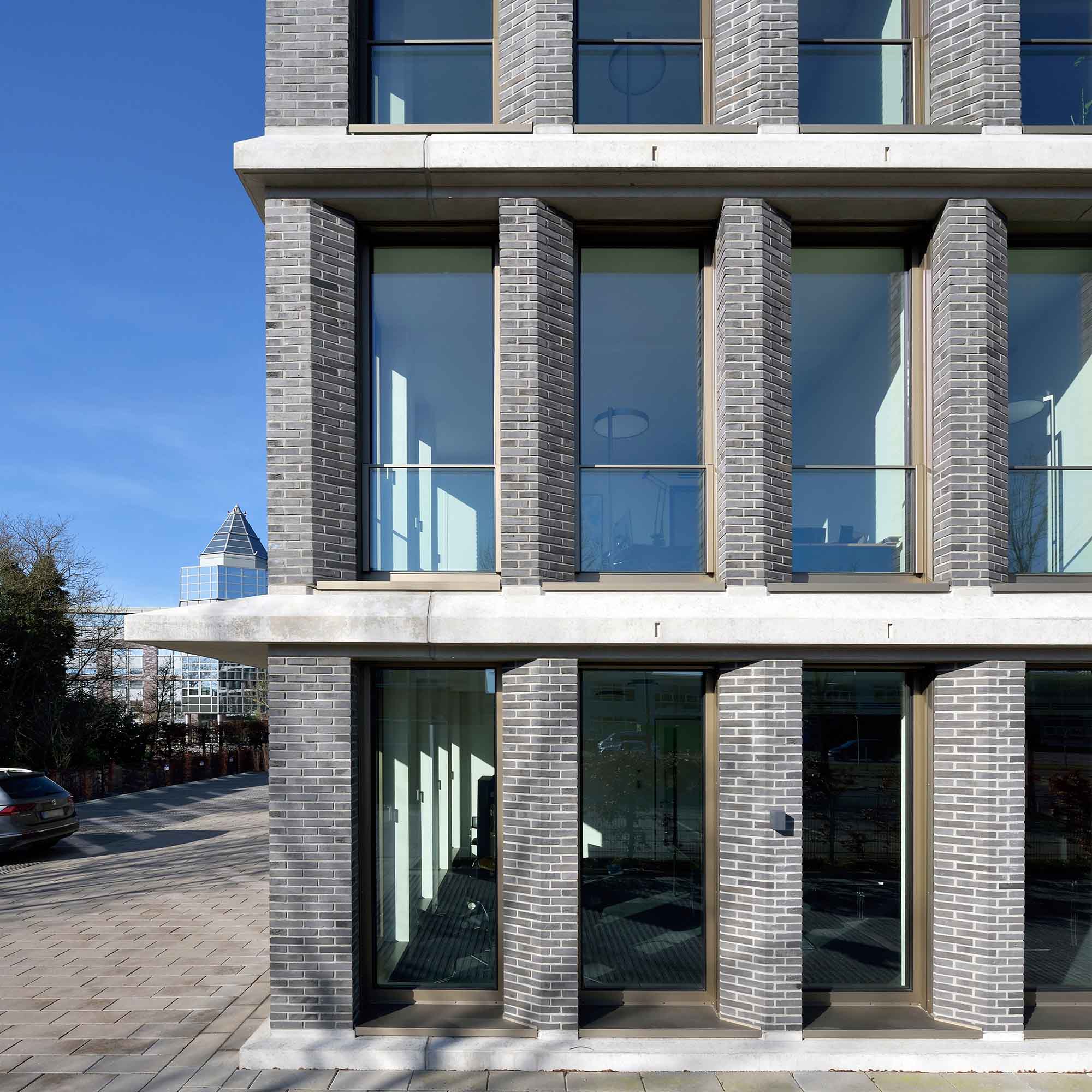 Die Längsseiten des viergeschossigen Bürogebäudes bieten offene Räume für Büroarbeit, Aktenschränke, Regale oder informellen Austausch an Stehtischen. Die Stirnseiten besitzen je nach Geschoss Areale für konzentriertes Arbeiten hinter Glaswänden oder Zonen für Kommunikation und Pausen. Der Gebäudekern beherbergt nicht nur Treppenhaus und Fahrstuhlanlage, in seinen Wänden gibt es auch Aussparungen für Küchenmodule, Garderoben oder ergänzende Besprechungsnischen.