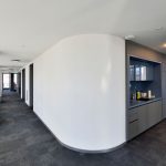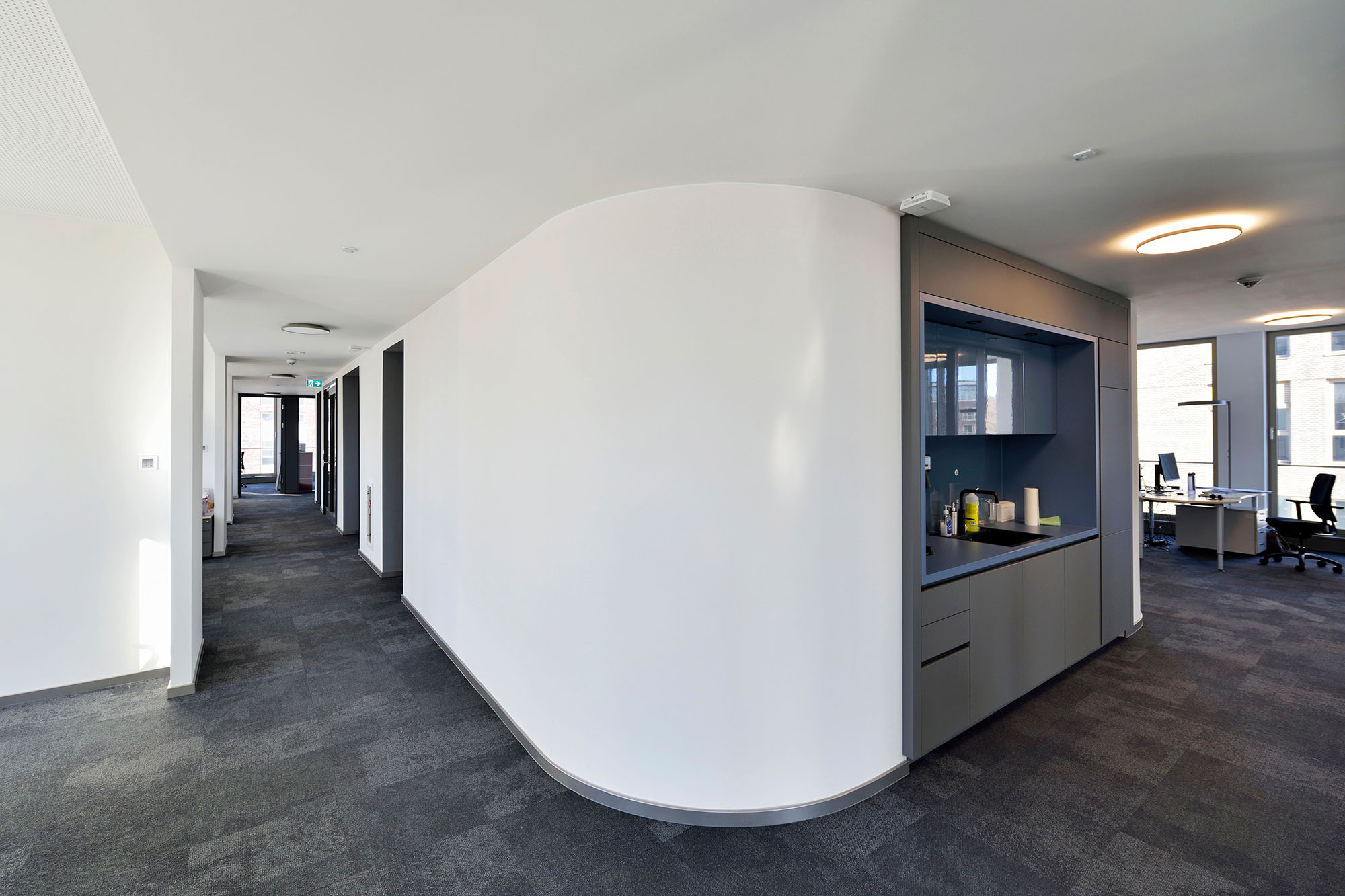 pb+ realisierte mit ihrer Tragwerksplanung im Inneren des Bürohauses einen mittigen Kern als Grundgerüst der alle statisch, technisch und infrastrukturell relevanten Funktionen erfüllt und gleichzeitig eine weitgehend stützenfreie, variable Bürolandschaft ermöglichte. Obwohl die erzielten stützenfreien Weiten laut pb+ Projektleiter Lothar Köster für Tragwerksplaner eher „normale Dimensionen“ aufweisen, ist das Ergebnis dennoch eindrucksvoll: Eine mit viel Tageslicht durchflutete, großzügige Raumwirkung und vielseitige Nutzungsoptionen.