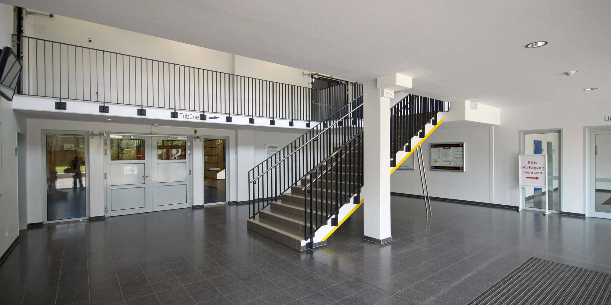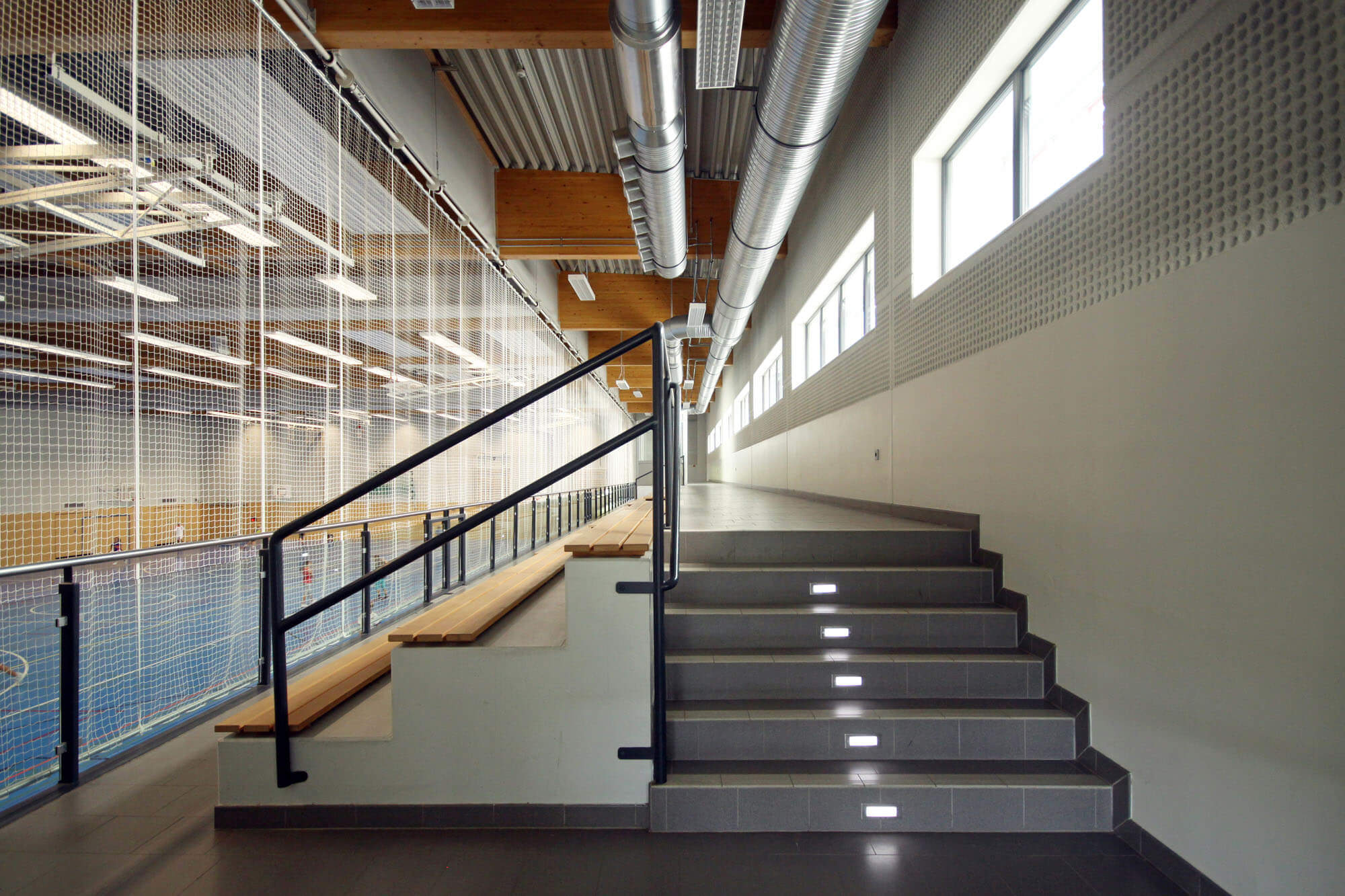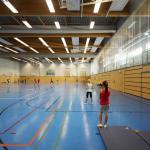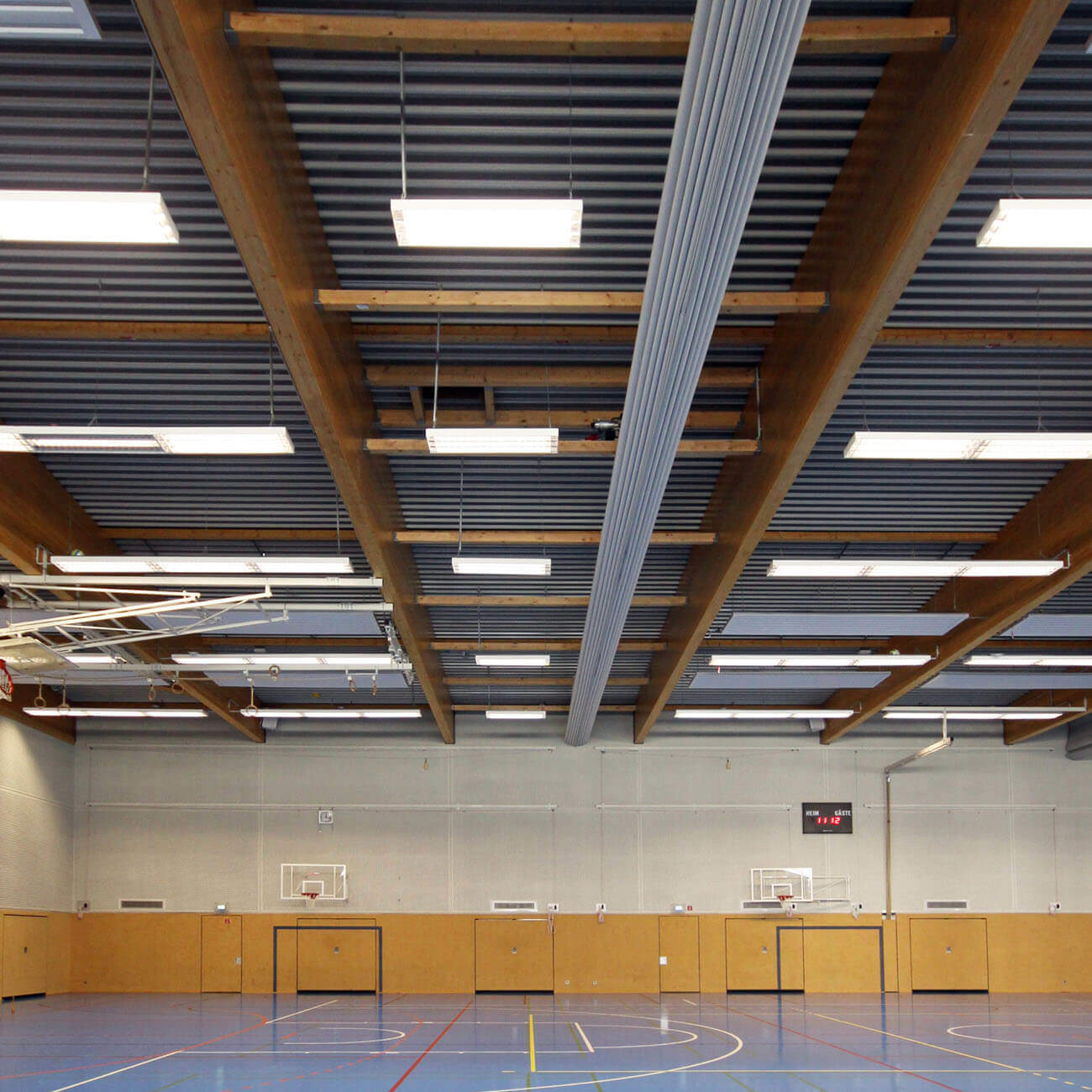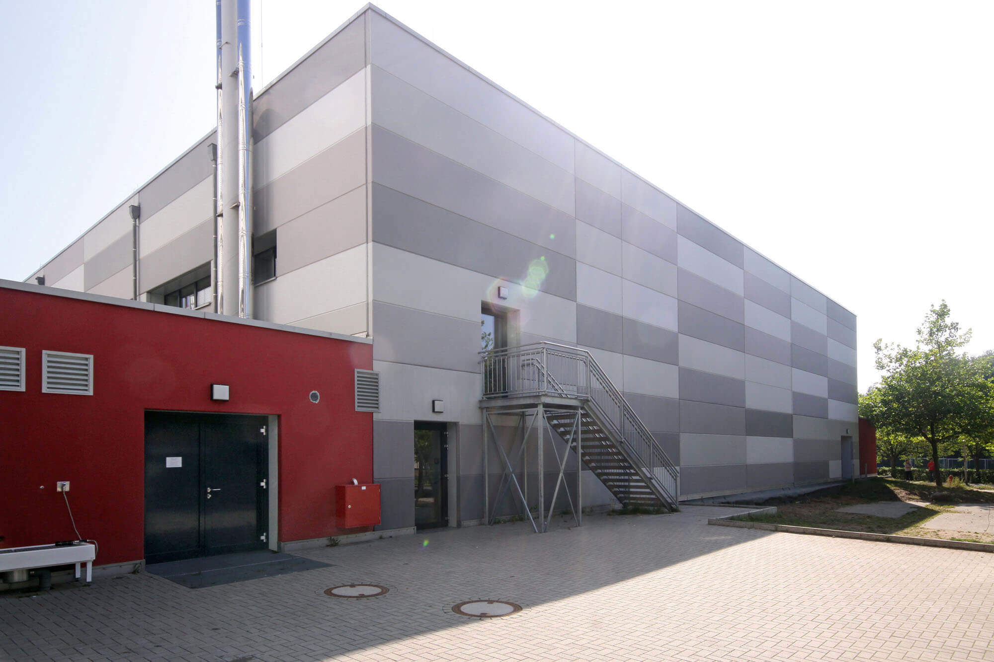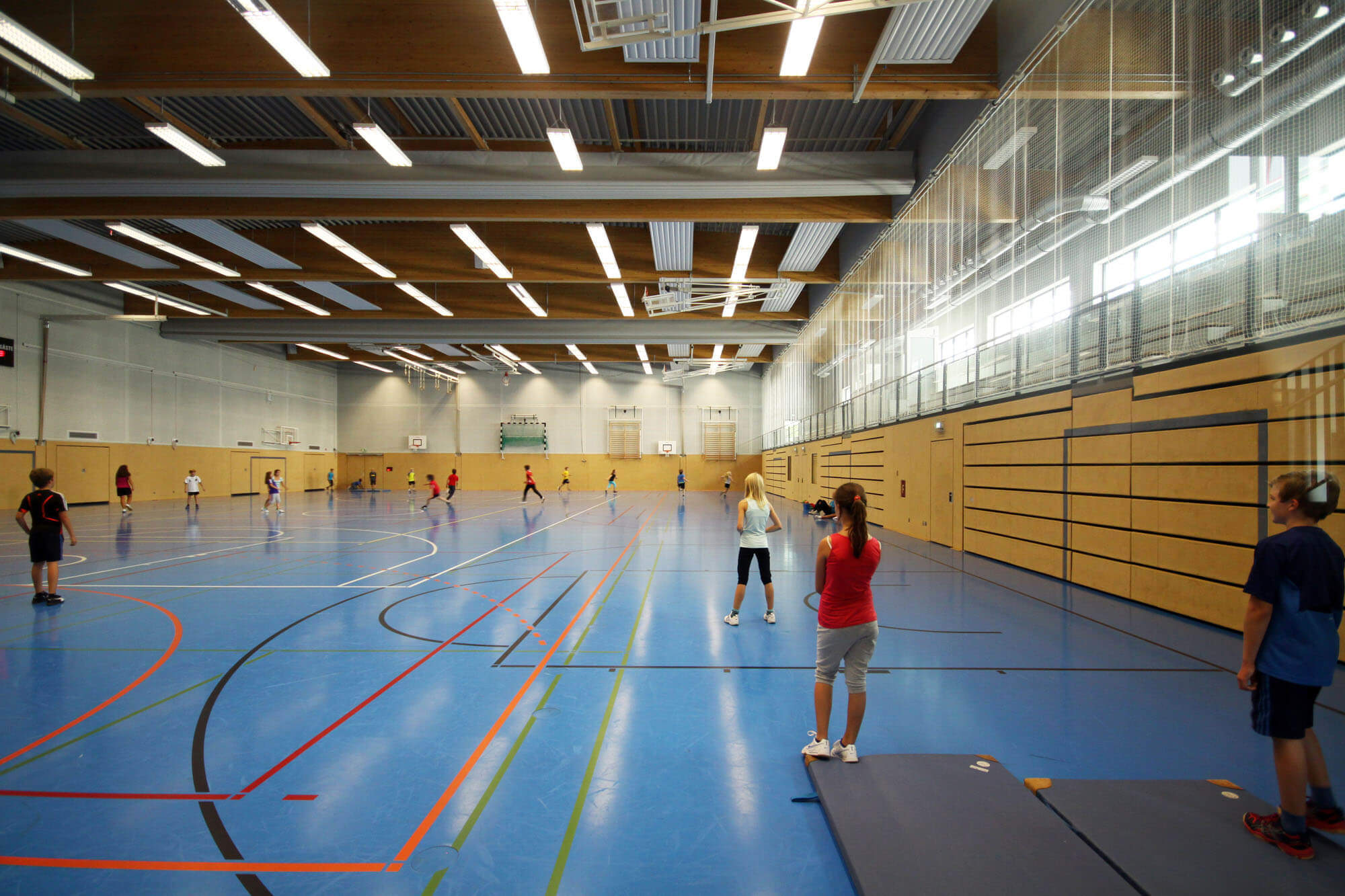Die Dreifeldsporthalle ist eine Fertigteilkonstruktion im Passivhausstandard (Berechnung gemäß PHPP-2007 des Passivhaus-Institutes Darmstadt). Die Abmessungen der Halle betragen ca. 51 x 35 m. Die Dachkonstruktion besitzt eine Eindeckung aus Stahltrapezprofilen auf verleimten Brettschichtholzbinder. Diese lagern auf am Fuß eingespannten Stahlbetonfertigteilstützen. Die Außenwände der Sporthalle bestehen aus vorgefertigten Stahlbetonwänden, die außenseitig eine nachträglich Verblendung erhielten. Angrenzende Bereiche für Foyer, Umkleiden, Duschen, WC, Lager für Sportgeräte wurden ebenfalls in massiver Bauweise und im Passivhausstandard errichtet. Die Halle verfügt über eine Photovoltaikanlage auf dem Dach sowie teilweise über einen Erdreichwärmetauscher. Letzterer eröffnet die Möglichkeit im Sommer zu „kühlen“ als auch im Winter die von außen angesaugte kalte Luft vorzuwärmen. So verbessert sich die Effizienz der Lüftungsanlage hinsichtlich Wärmerückgewinnung deutlich.