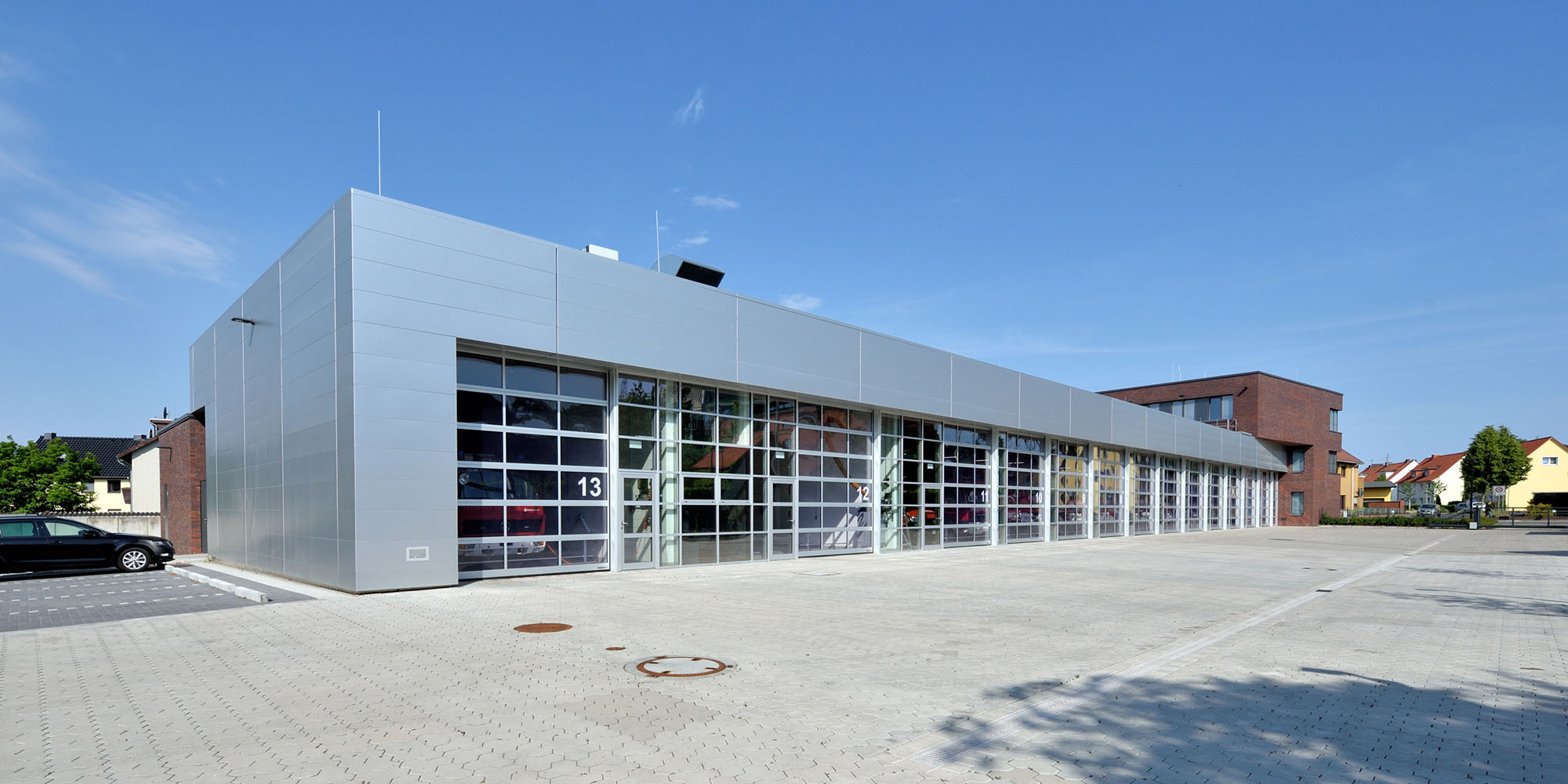 Zwei Bauabschnitte, um die Einsatzfähigkeit zu gewährleisten. Der Neubau erfolgte in zwei Bauabschnitten auf 5.800 qm. Nach dem Abriss einer Tankstelle und zwei Häusern auf den Nachbargrundstücken, startete der erste Gebäudeabschnitt auf dem bisherigen Feuerwehr-Areal Nr. 52 mit einem dreistöckigen Bürogebäude und einer daran anschließenden, leicht abknickenden und zunächst noch verkürzten Hallenversion. Mit dem leicht asymmetrischen Kopfbau parallel zur Hauptstraße und der abknickenden Halle reagierten die Planer auf den Verlauf des zur Verfügung stehenden Bauplatzes. Eine westliche Anrückseite wurde für Fahrzeuge der Feuerwehrmitglieder eingeplant, die östliche Seite blieb als Ausrückbereich für die Einsatzfahrzeuge bestehen. Erst nach dem Umzug der Wehr in das neue Domizil, konnte das alte Gebäude am hinteren Ende des Grundstücks ohne Gefährdung der Einsatzbereitschaft abgerissen und mit der Verlängerung der Halle der zweite Bauabschnitt vollendet werden.
