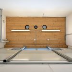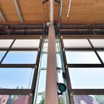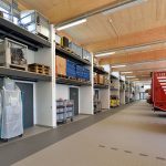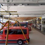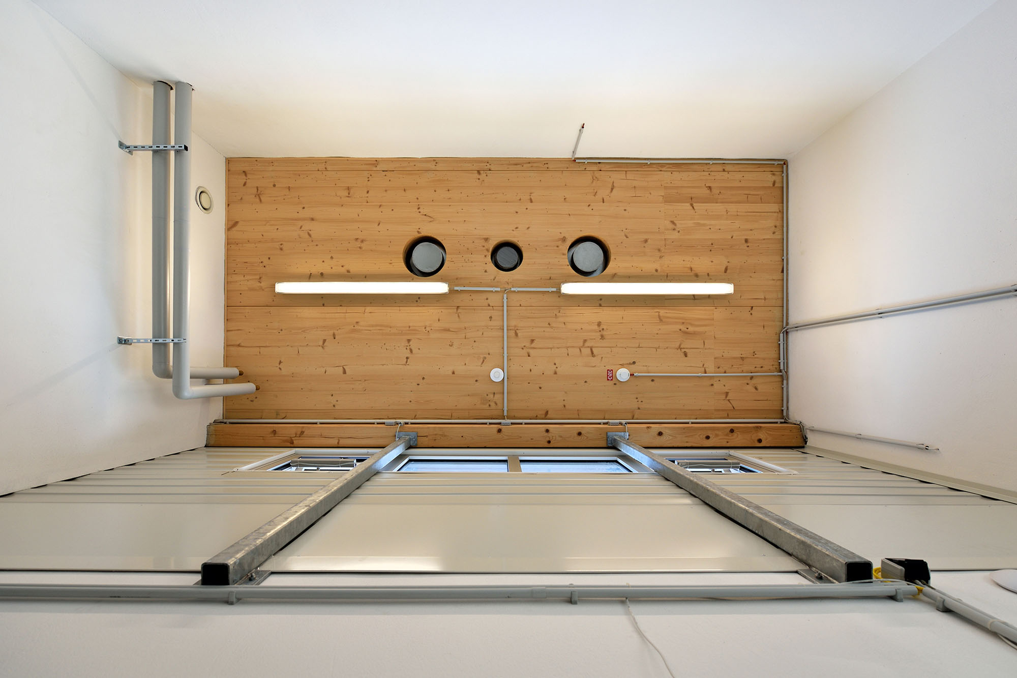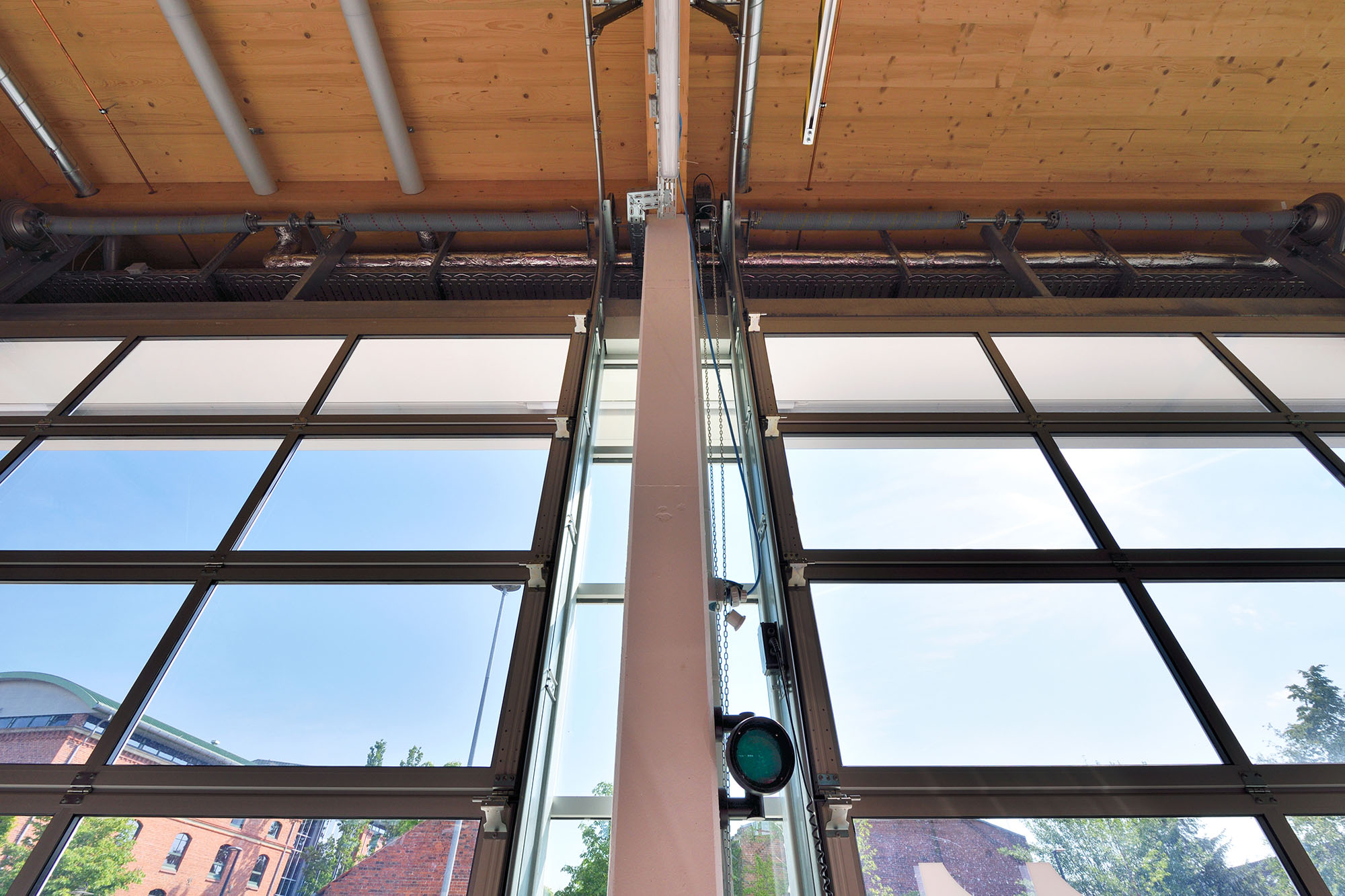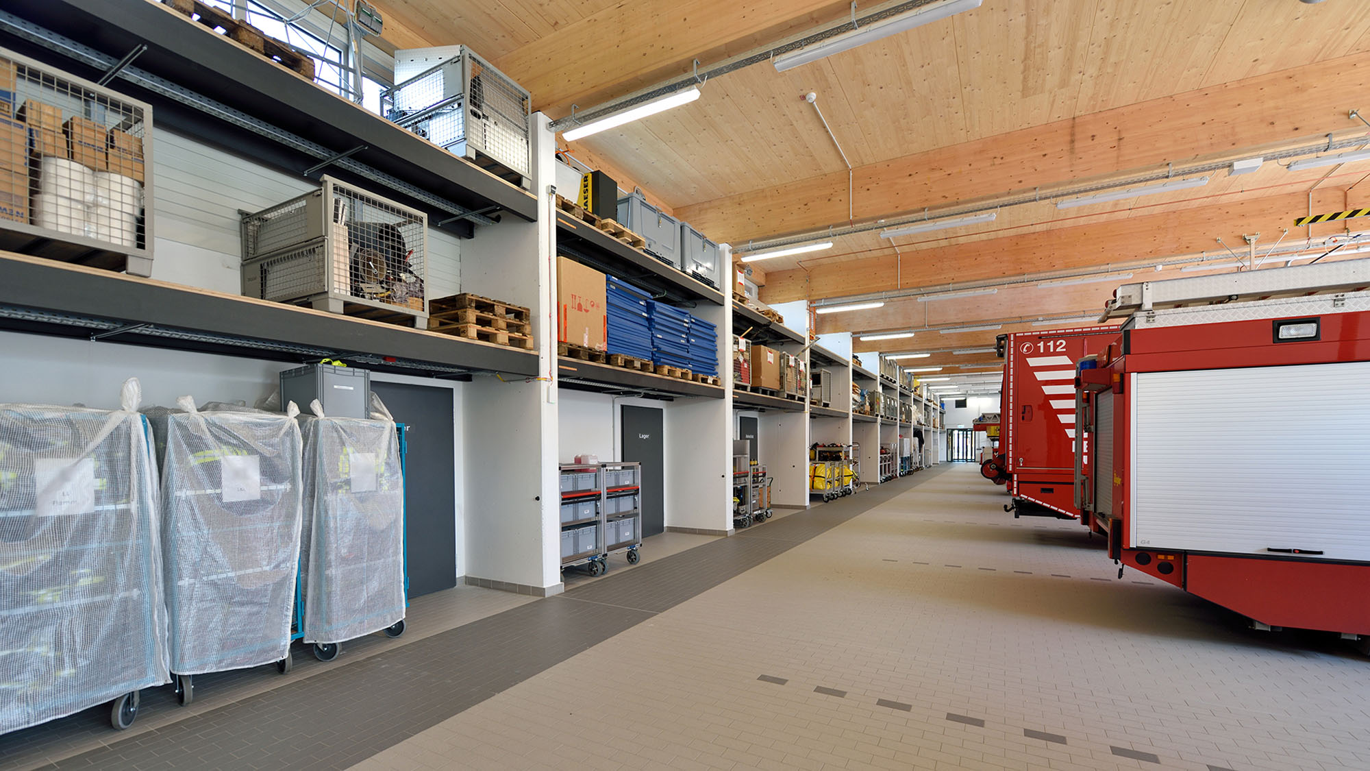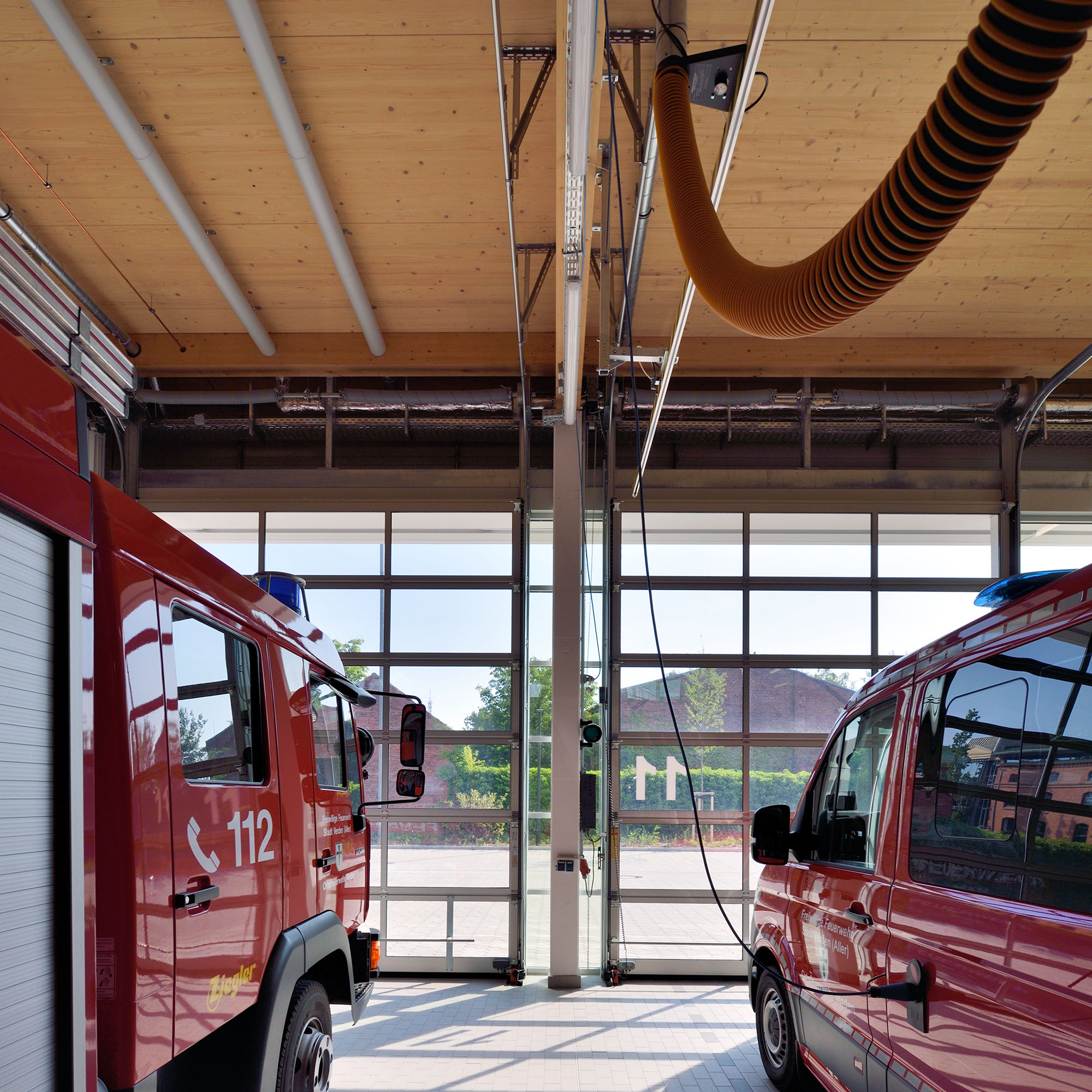 Großzügige Räumlichkeiten und nachhaltige Ausstattung. Der dreigeschossige Flachbau wurde in Stahlbeton und Porenbetonmauerwerk mit Klinkervorsatzschale ausgeführt. Er enthält neben Büros auch Räume für die Pausen-, Küchen- und Unterrichtsnutzung sowie für die Feuerwehrbekleidung. Der Hallenbau besitzt auf der Westseite ein schmales flankierendes Nebengebäude und bietet Platz für 11 Feuerwehrfahrzeuge, eine Werkstatt, Waschhalle sowie Sanitär-, Lager- und Funktionsräume. Als Tragwerk dienen hier zunächst Stahlbetonfertigteilstützen mit Fundamentfuß. Da der Stadtrat Wert auf Nachhaltigkeit legte, plante pb+ mit nachfolgend aufliegenden Holzbindern sowie mit 5 Meter breiten Streifen aus Brettsperrholzplatten unter dem Dach. Für die Tragwerksplanung war zu berücksichtigen, dass die Feuerwehr auf dem Hallendach einen Übungsplatz vorsah. Beide Baukörper besitzen eine moderne Ausstattung mit Blick auf Nachhaltigkeit. Das Dach trägt überwiegend eine Konstruktion aus Holz, Wärme liefert eine Holz-Pelletheizung in Kombination mit einer Gas-Brennwerttherme und das Regenwasser sammelt sich in einer unterirdischen Zisterne, wo es von der Feuerwehr genutzt werden kann.