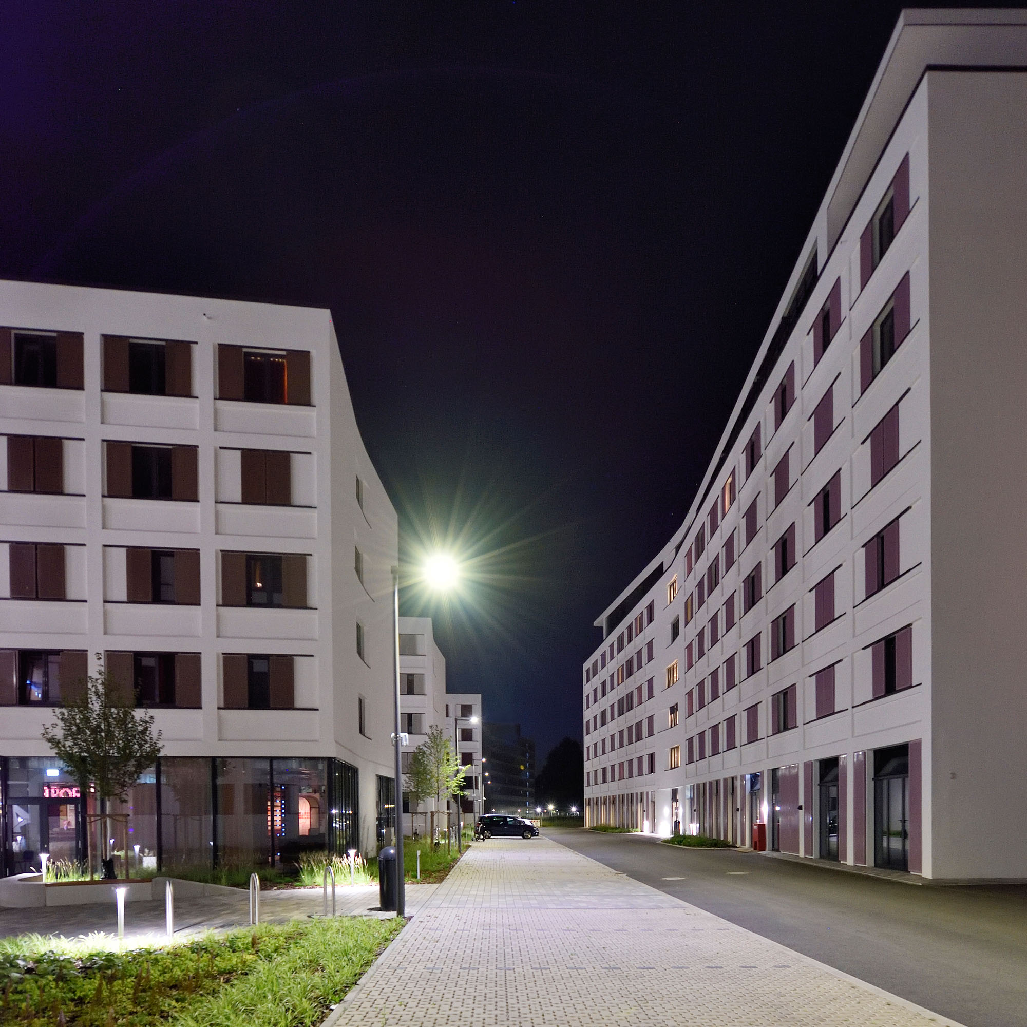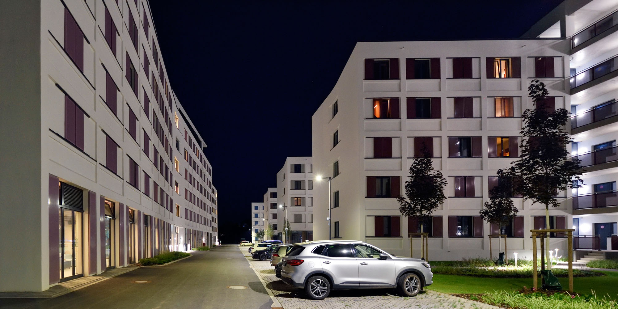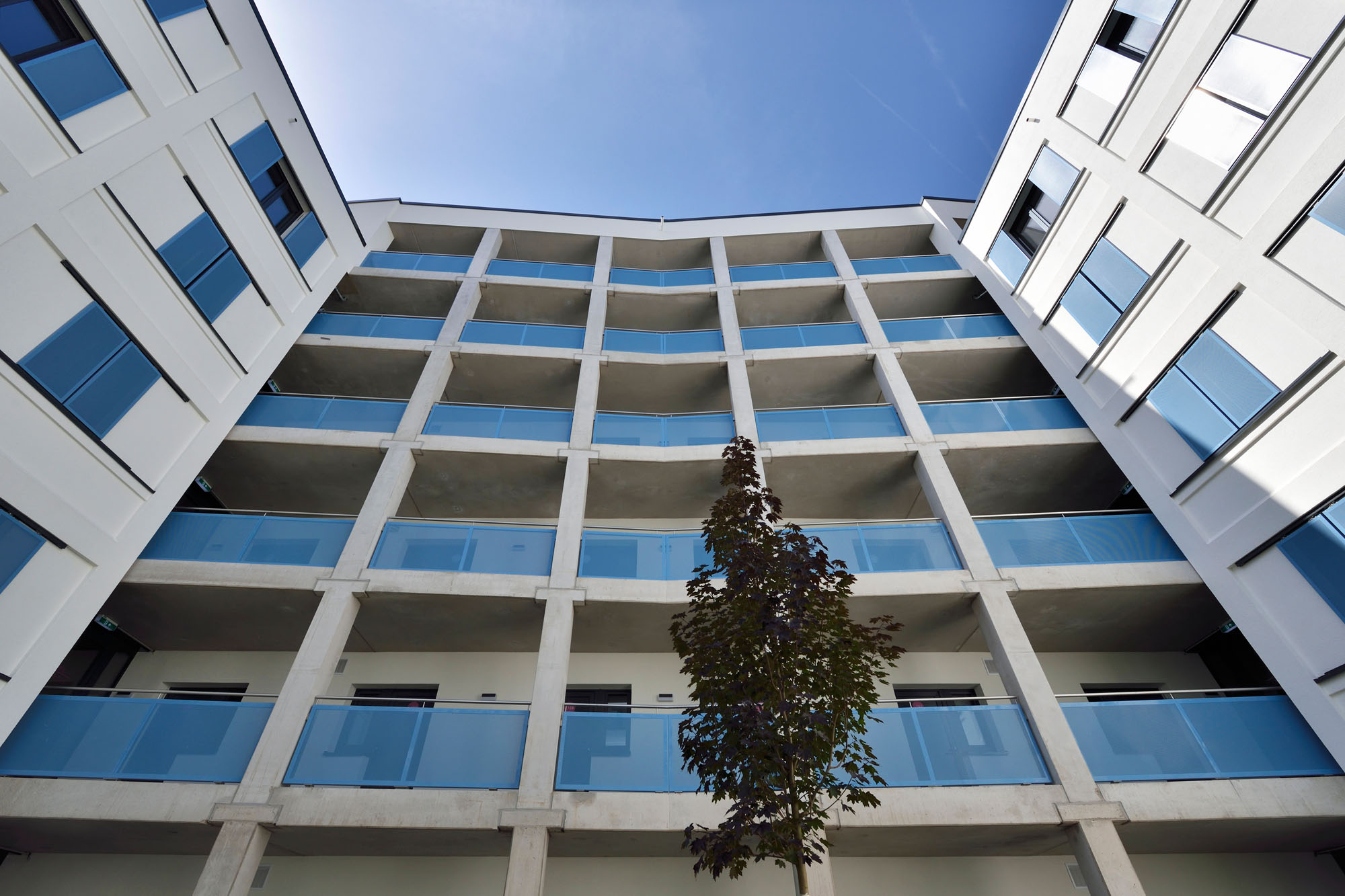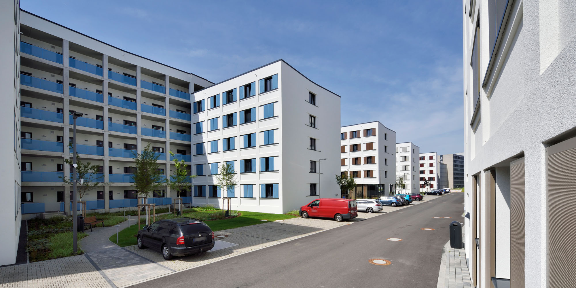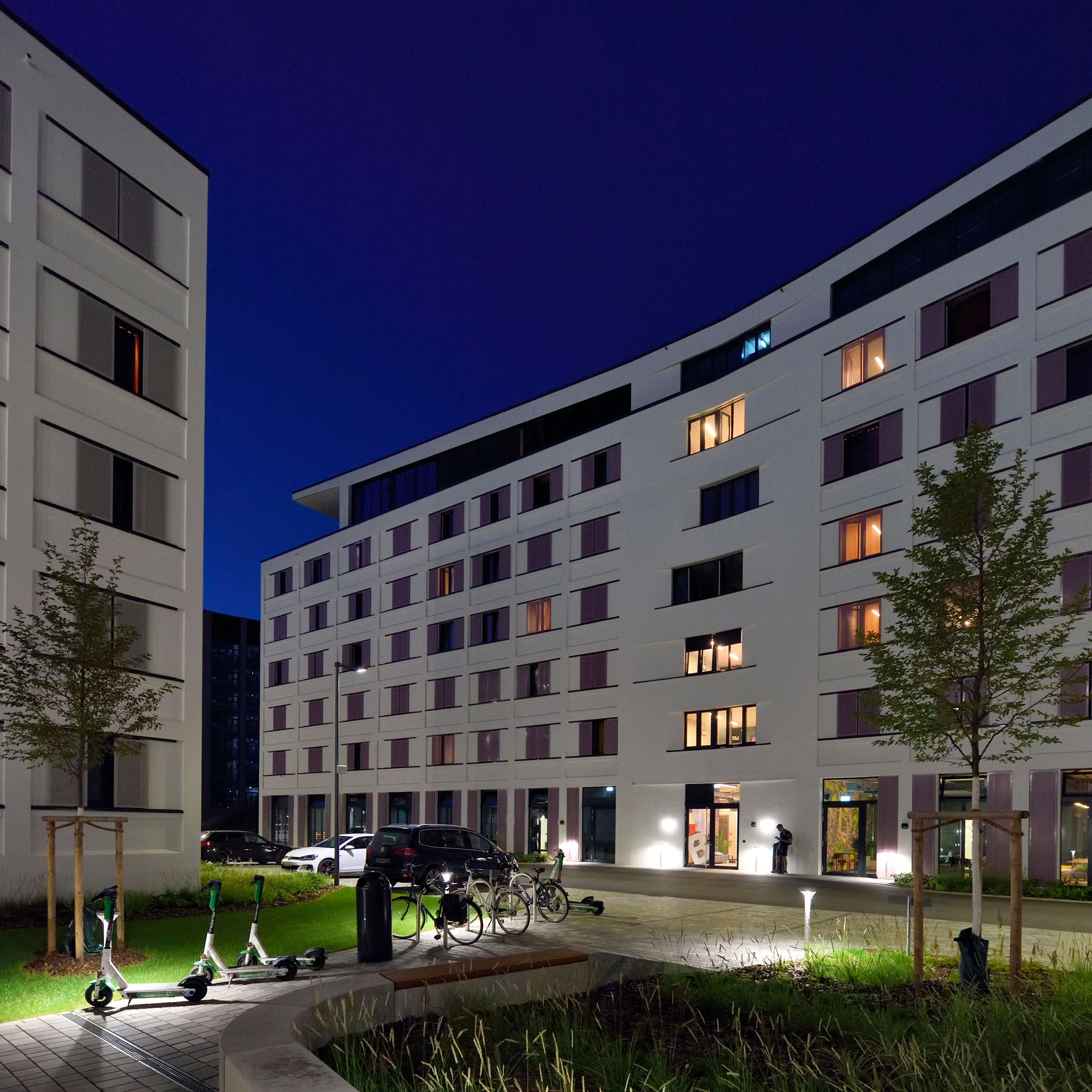 Die pb+ Ingenieurgruppe AG leistete für die Göttinger Wohnanlage von Basecamp die Tragwerksplanung LPH 3-5. Die Konstruktion erfolgte in Schottenbauweise aus Stahlbeton-Halbfertigteilen. Bei der Bemessung der freitragenden Elementdecken war der vorgesehene Einbau von Fertigteilbädern zu berücksichtigen. Aufgrund der geometrischen Abhängigkeiten wurden gesonderte Nachweise der Querkrafttragfähigkeiten und die Abstimmung bezüglich der Bewehrungsausführung erforderlich.