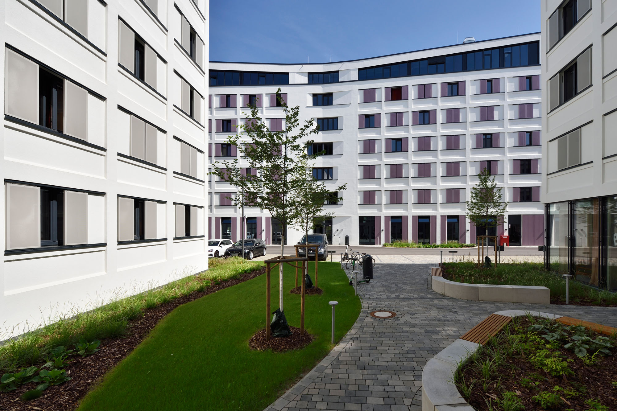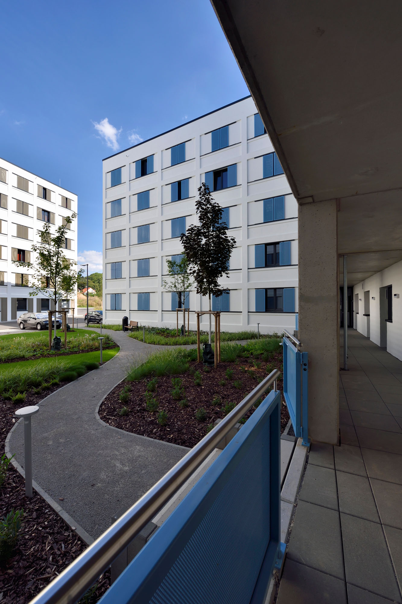 Hinter der zweiten Gebäudereihe des Wohnheimkomplexes befindet sich ein Nachbargrundstück, auf dem ein neues städtisches Wohngebiet entsteht. Durch die vorherigen Erdarbeiten für das Wohnheim und den Beginn der Arbeiten auf dem Nachbargrundstück entstand an der Grenze zwischen den beiden Grundstücken auf breiter Front ein hoher Erdhügel. pb+ plante den Einsatz von Winkelstützwänden, die sich in ihrer Größe an die Höhe des Hügels anpassen, um die Erde hinter dem Parkbereich der zweiten Gebäudereihe abzustützen und einen möglichen Erdrutsch zu verhindern.