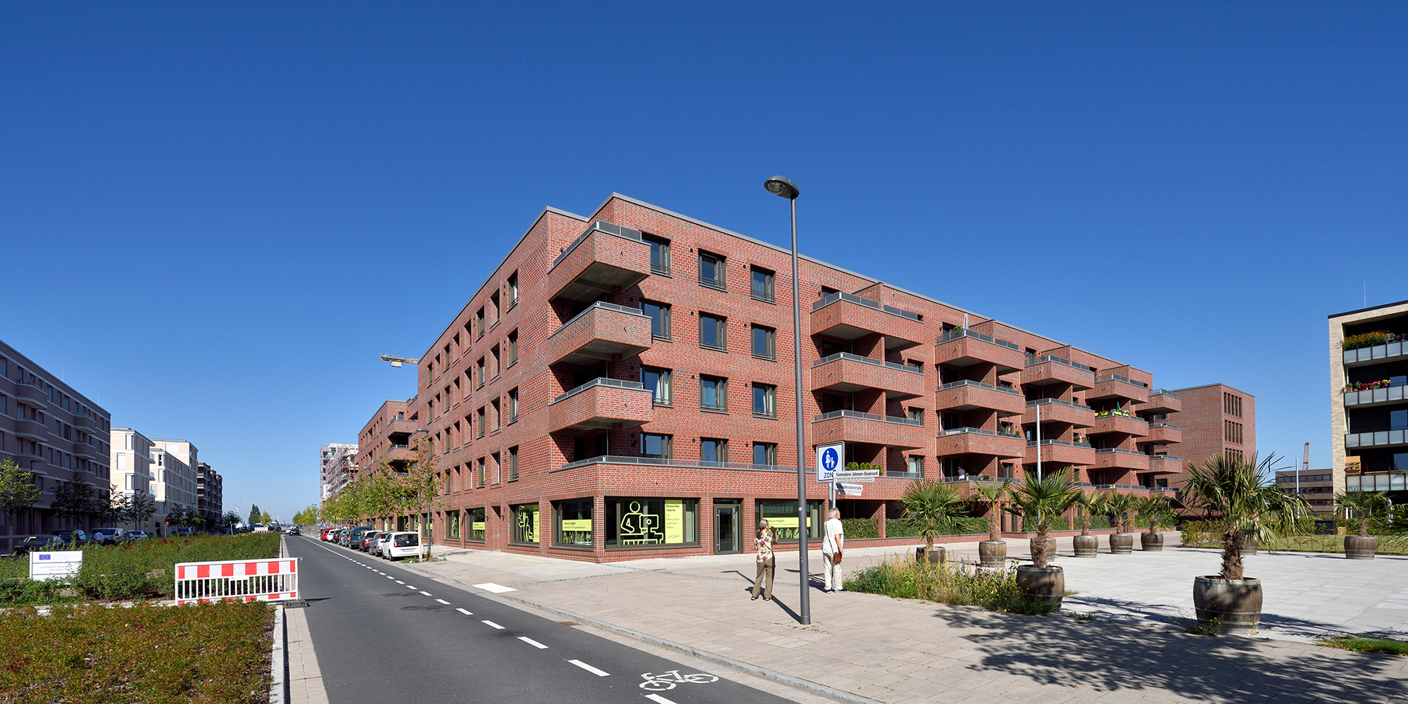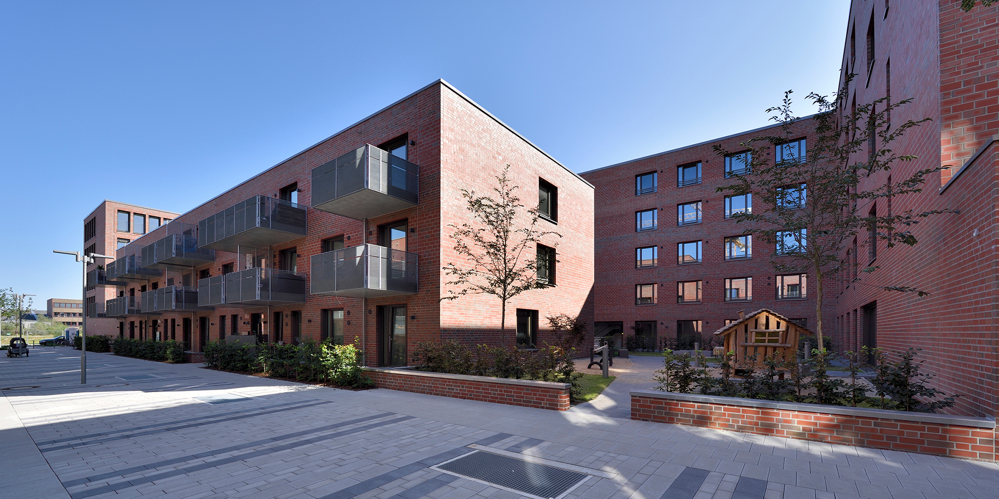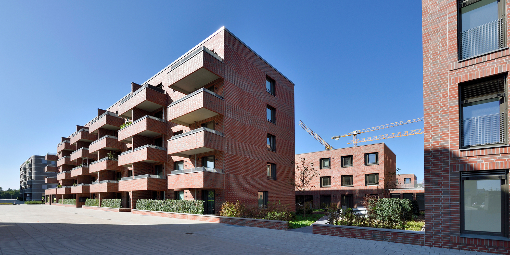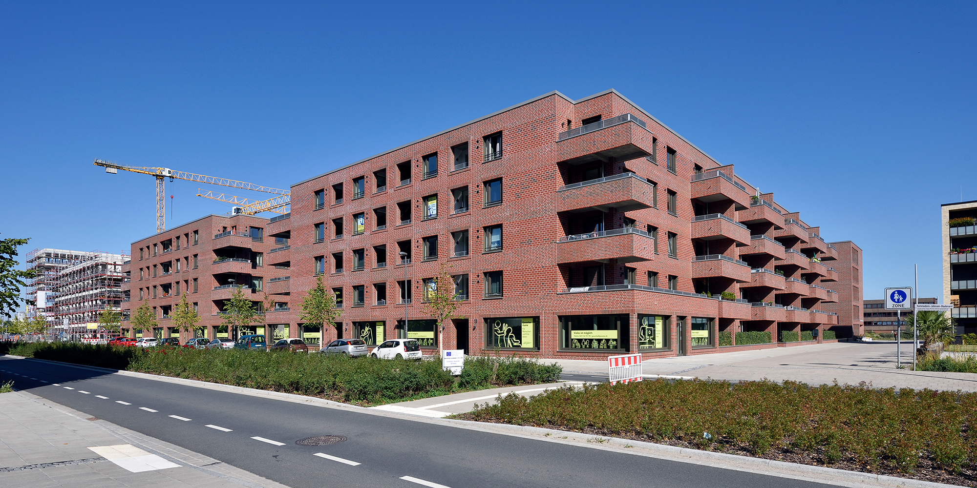 Die drei- bis fünfgeschossigen Gebäude weisen eine rote Klinkerfassade mit unterschiedlich groß gesetzten Steinen auf. Ein Fußgänger-Boulevard unterteilt die Wohnanlage mittig in zwei Hälften. Balkone entlang dieses Fußgängerareals sowie begrünte Innenhöfe zwischen den dreigeschossigen Wohnblöcken laden zum Entspannen oder zum nachbarschaftlichen Plausch ein. Eine Tiefgarage unter dem Bau-Ensemble bietet Stellplätze für die Autos der Bewohner*innen sowie der Angestellten der beiden großen Bürogebäude, die den Komplex zur Herzogin-Cecilie-Allee abschließen. Die Räume im Erdgeschoss entlang des Kommodore-Johnsen-Boulevards sind für Einzelhandel, Dienstleistung und Arztpraxen vorgesehen. Weitere Standortqualität bietet nach nur ca. 100 m Fußweg das Weserufer, wo die Bewohner*innen maritime Luft schnuppern und den Schiffverkehr beobachten können.