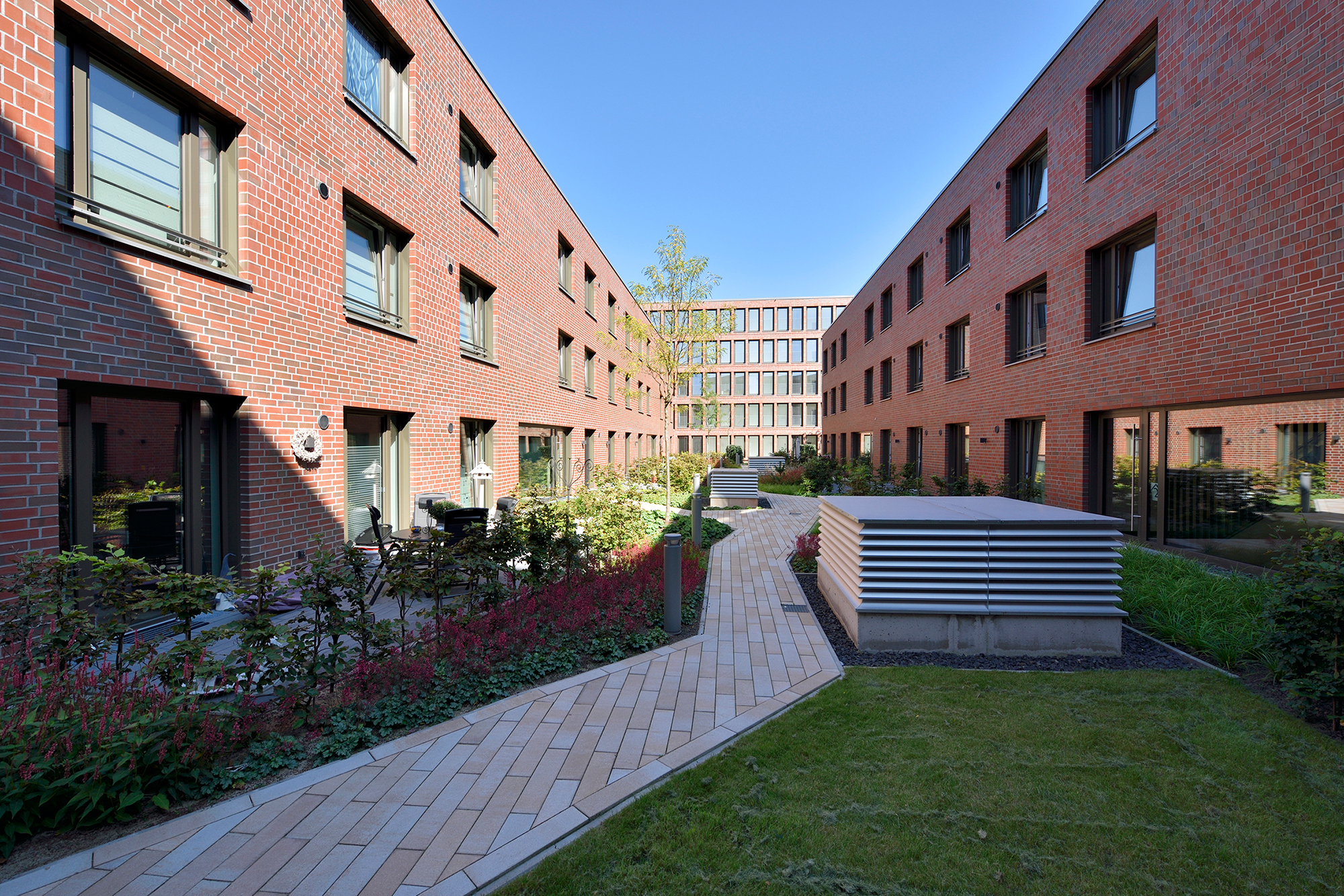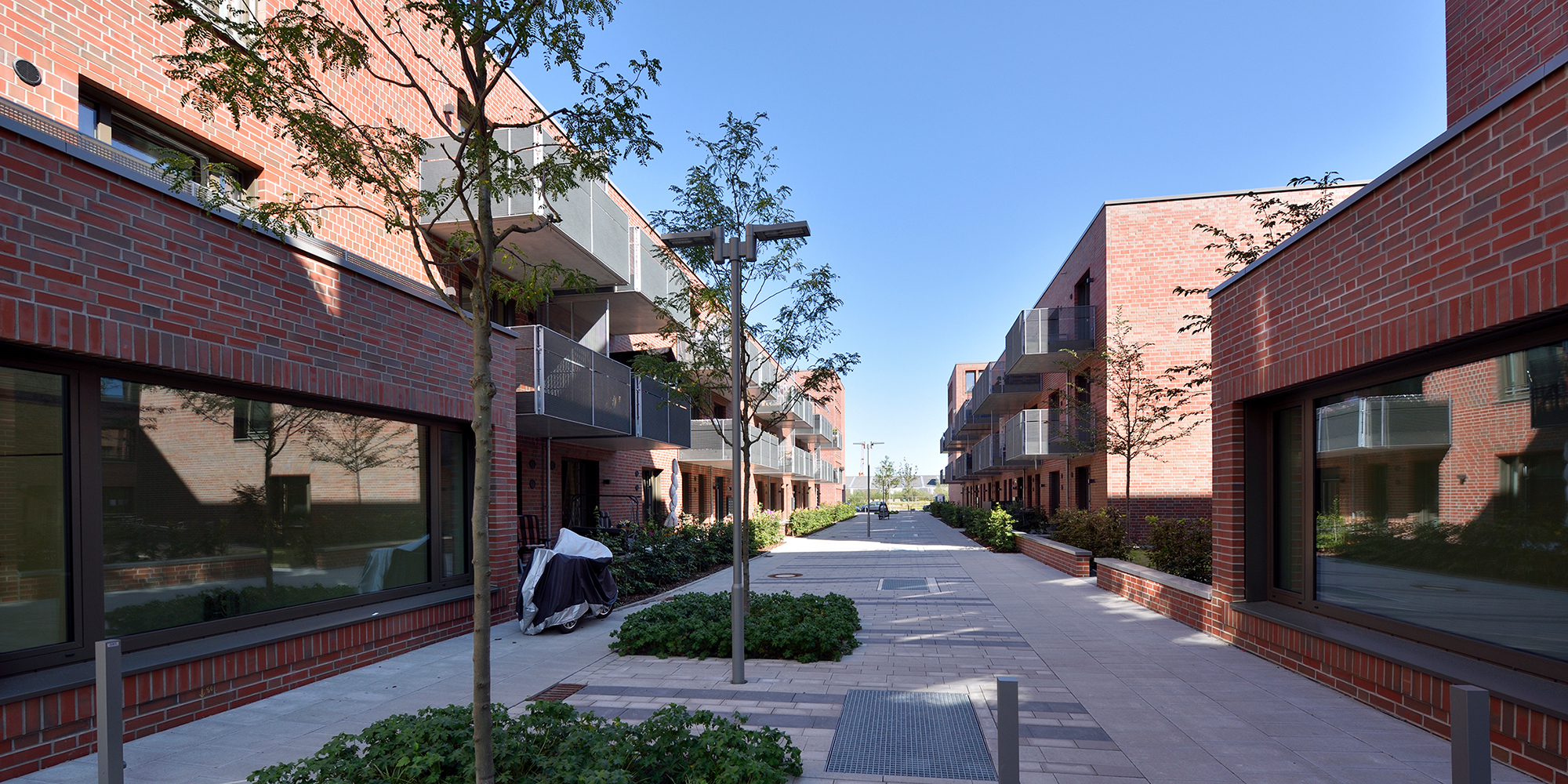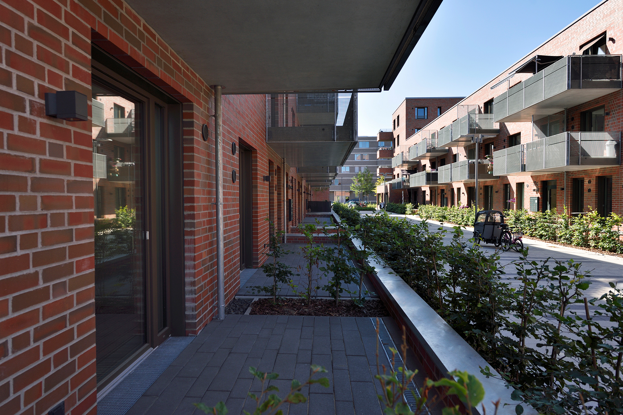 Die drei- bis fünfgeschossigen Gebäude weisen eine rote Klinkerfassade mit unterschiedlich groß gesetzten Steinen auf. Ein Fußgänger-Boulevard unterteilt die Wohnanlage mittig in zwei Hälften. Balkone entlang dieses Fußgängerareals sowie begrünte Innenhöfe zwischen den dreigeschossigen Wohnblöcken laden zum Entspannen oder zum nachbarschaftlichen Plausch ein. Eine Tiefgarage unter dem Bau-Ensemble bietet Stellplätze für die Autos der Bewohner*innen sowie der Angestellten der beiden großen Bürogebäude, die den Komplex zur Herzogin-Cecilie-Allee abschließen. Die Räume im Erdgeschoss entlang des Kommodore-Johnsen-Boulevards sind für Einzelhandel, Dienstleistung und Arztpraxen vorgesehen. Weitere Standortqualität bietet nach nur ca. 100 m Fußweg das Weserufer, wo die Bewohner*innen maritime Luft schnuppern und den Schiffverkehr beobachten können.