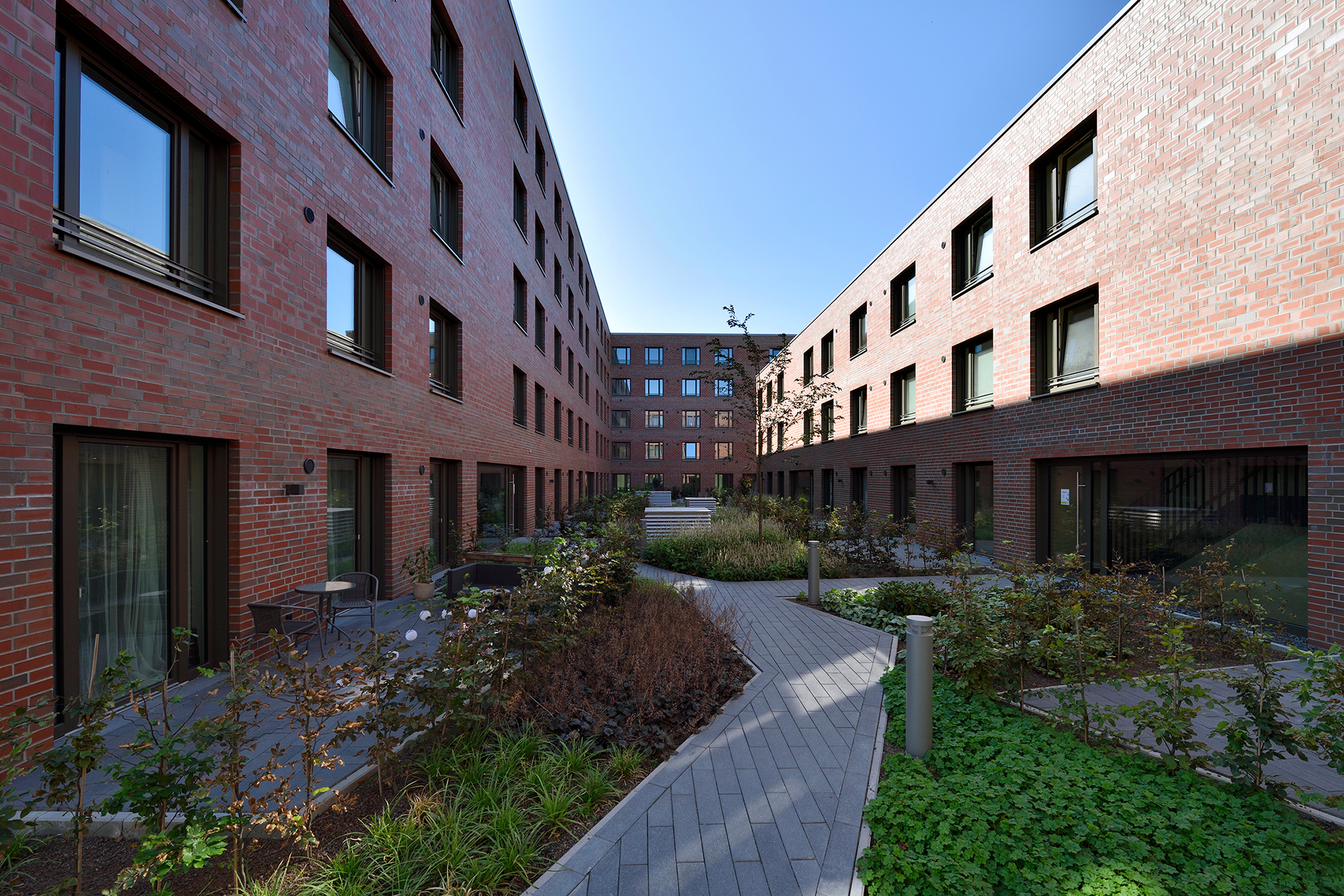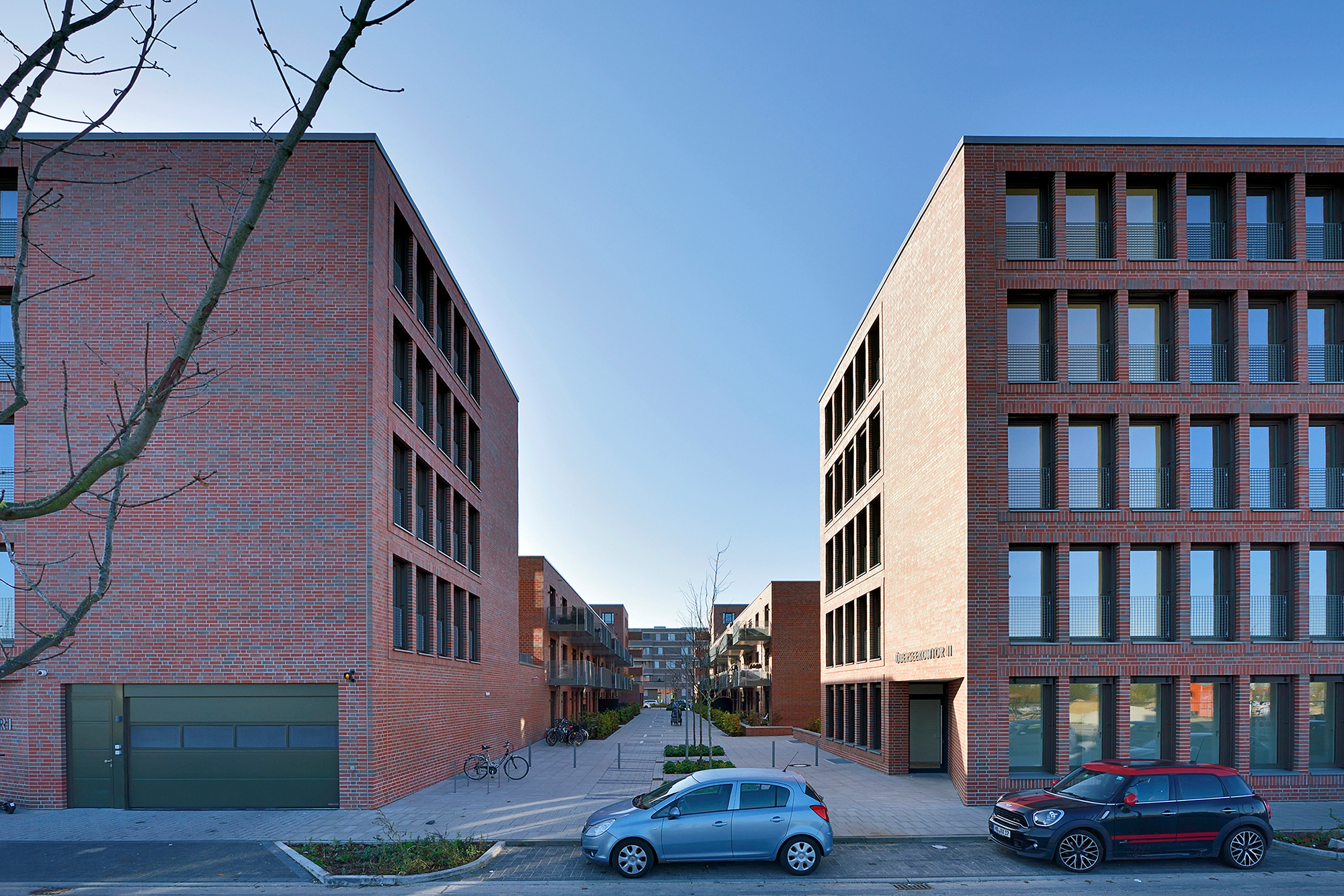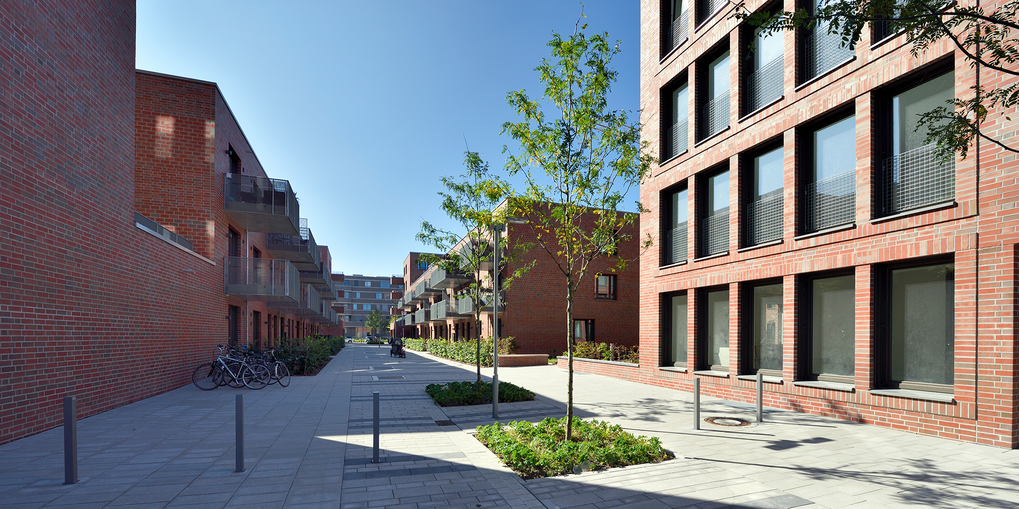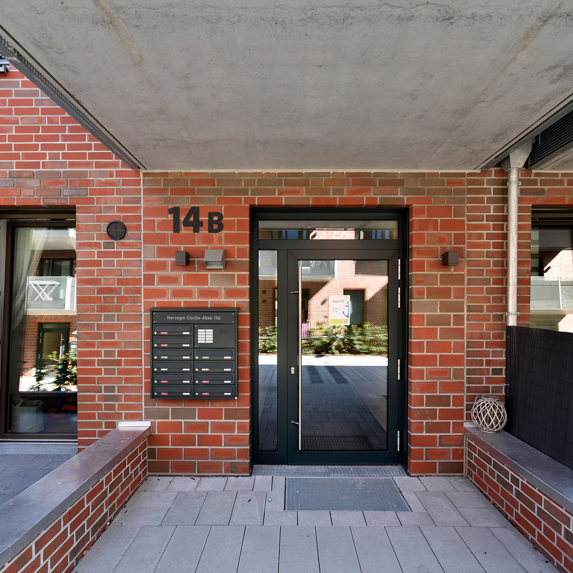 Die drei- bis fünfgeschossigen Gebäude weisen eine rote Klinkerfassade mit unterschiedlich groß gesetzten Steinen auf. Ein Fußgänger-Boulevard unterteilt die Wohnanlage mittig in zwei Hälften. Balkone entlang dieses Fußgängerareals sowie begrünte Innenhöfe zwischen den dreigeschossigen Wohnblöcken laden zum Entspannen oder zum nachbarschaftlichen Plausch ein. Eine Tiefgarage unter dem Bau-Ensemble bietet Stellplätze für die Autos der Bewohner*innen sowie der Angestellten der beiden großen Bürogebäude, die den Komplex zur Herzogin-Cecilie-Allee abschließen. Die Räume im Erdgeschoss entlang des Kommodore-Johnsen-Boulevards sind für Einzelhandel, Dienstleistung und Arztpraxen vorgesehen. Weitere Standortqualität bietet nach nur ca. 100 m Fußweg das Weserufer, wo die Bewohner*innen maritime Luft schnuppern und den Schiffverkehr beobachten können.