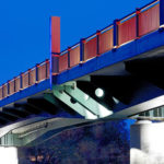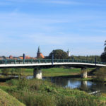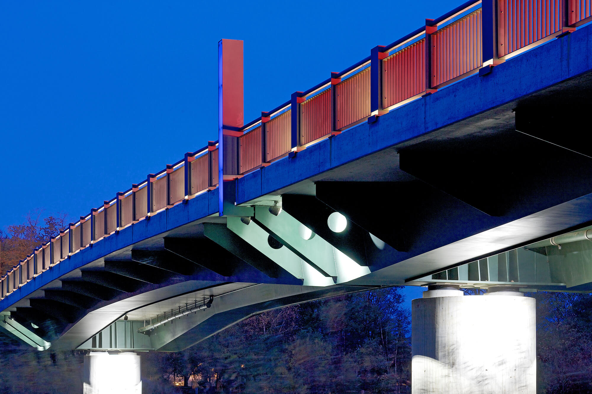 Vorteile: Die Stahlträger wurden so dimensioniert, dass sie ohne zusätzliche Unterstützungen die Betonierlasten tragen konnten und so keine weiteren Eingriffe in das Biotop erforderlich wurden. Der hohe Vorfertigungsgrad der Stahlbauweise, gemeinsam mit der Anwendung von mittragenden Stahlbetonhalbfertigteilen als Schalung, garantierte eine kurze Bauzeit. Das bewusst zurückhaltend gestaltete Tragwerk passt sich natürlich in die Auenlandschaft ein und unterstreicht den Vorrang der historischen Stadtsilhouette. Ein angemessenes Beleuchtungskonzept bringt die Brücke auch bei Nacht zur Geltung.