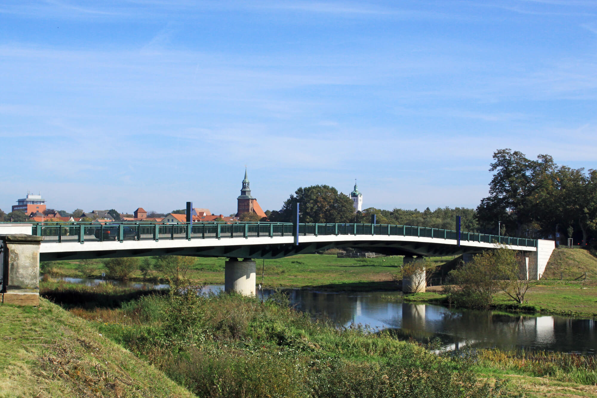 Herausforderung: Bei der Planung des Neubaus der Straßenbrücke in Verden waren durch pb+, zahlreiche Randbedingungen zu beachten, u. a.: ausreichend große lichte Öffnung für den Hochwasserschutz / möglichst kurze Bauzeit / keine Beeinflussung des umgebenden Biotops bei der Errichtung / Einpassung in das Landschafts und Stadtbild /angemessene Gestaltung.