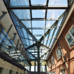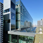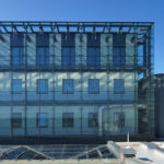 Glasscheiben aus ESG-H bilden die neue Vorhangfassade, welche sich an den Längs- und Querseiten der Scheiben ca. 2-3 cm überlappen. Bedingt durch die Glasklemmhalter, welche jeweils 2 Scheiben aufnehmen, entsteht eine leichte Schrägstellung der Scheiben von ca. max. 2° Grad. Die Absturzsicherung auf den Fassadenumgängen gewährleistet eine gesonderte Konstruktion, d. h. die Scheiben übernehmen keine absturzsichernde Funktion, sondern werden horizontal ausschließlich durch Windlasten beansprucht. Als Vertikalbeanspruchung setzte pb+ neben den Lasten aus Eigengewicht aufgrund der exponierten Lage auch Eislast in Höhe von 10 kg/m² voraus.