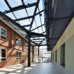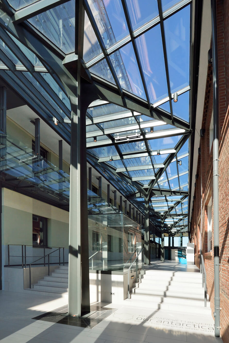 Seewasserhaltige Witterungseinflüsse führten zu einer starken Abnutzung der aus Aluminium bestehenden Fluchtbalkone am Gebäude C des Alfred-Wegener-Instituts (AWI) in Bremerhaven. Im Zuge der Aufstockung des 70er Jahre-Gebäudes C sollten sowohl eine flächenmäßige Erweiterung der Nutzfläche, eine Kernsanierung der gesamten haustechnischen Anlagen und eine energetische Sanierung sämtlicher Außenbauteile wie Fenster, Wände und der Dachkonstruktion gemäß derzeitigem Standard (EnEV 2009) erfolgen. Gewünscht wurde auch eine Neuerrichtung des Foyers (siehe Referenzbeispiel Überdachung) sowie eine Gesamtintegration der einzelnen Gebäude untereinander.